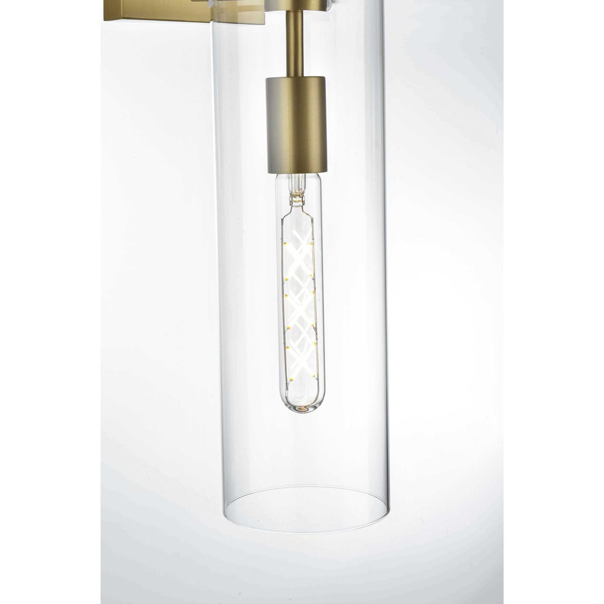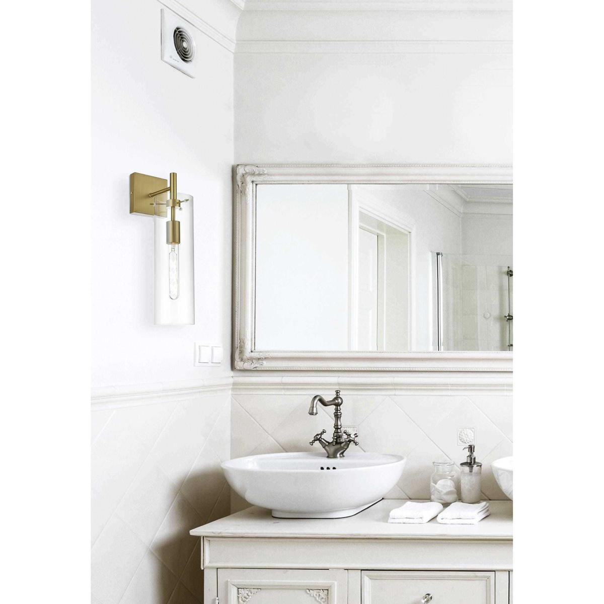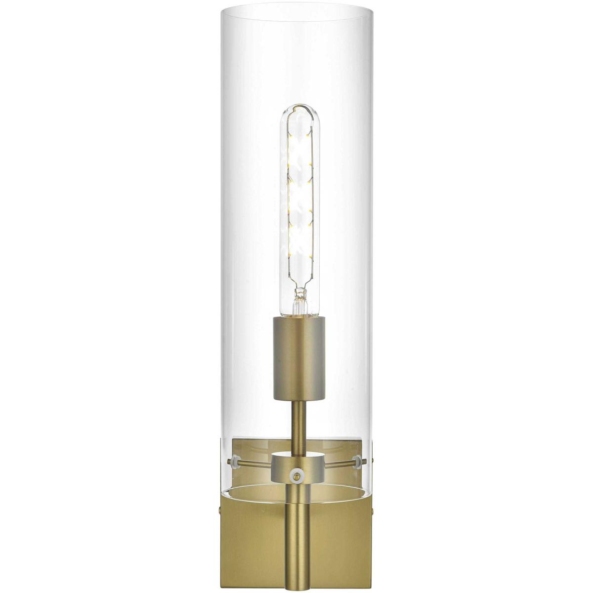 Elevate the ambiance of your space with this stunning wall sconce. Featuring a sleek satin gold finish, this wall sconce blends modern style with classic elegance. The short metal arm supports a cylindrical clear glass shade that beautifully showcases the bulb, adding a striking architectural detail. Its minimalist square backplate and short torch-like design create a sophisticated silhouette, perfect for any roomfrom a hallway or living room to a bathroom or bedroom. The satin gold finish adds a reflective quality that enhances its modern appeal while complementing other metallic accents in your decor. This sconce requires one E26 socket bulb (not included) and is compatible with dimmable features, allowing you to set the perfect lighting mood.