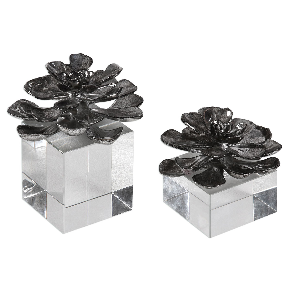 Simple Elegance Is Achieved By These Antiqued, Metallic Silver Lotus Blooms That Appear To Be Floating On Clear Crystal Cubes. Sizes: Sm-6x5x6, Lg-6x7x6