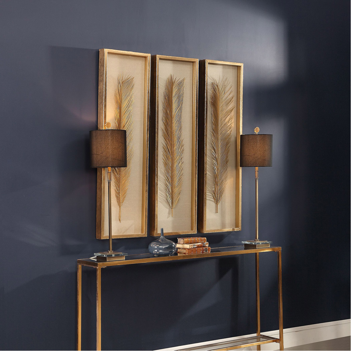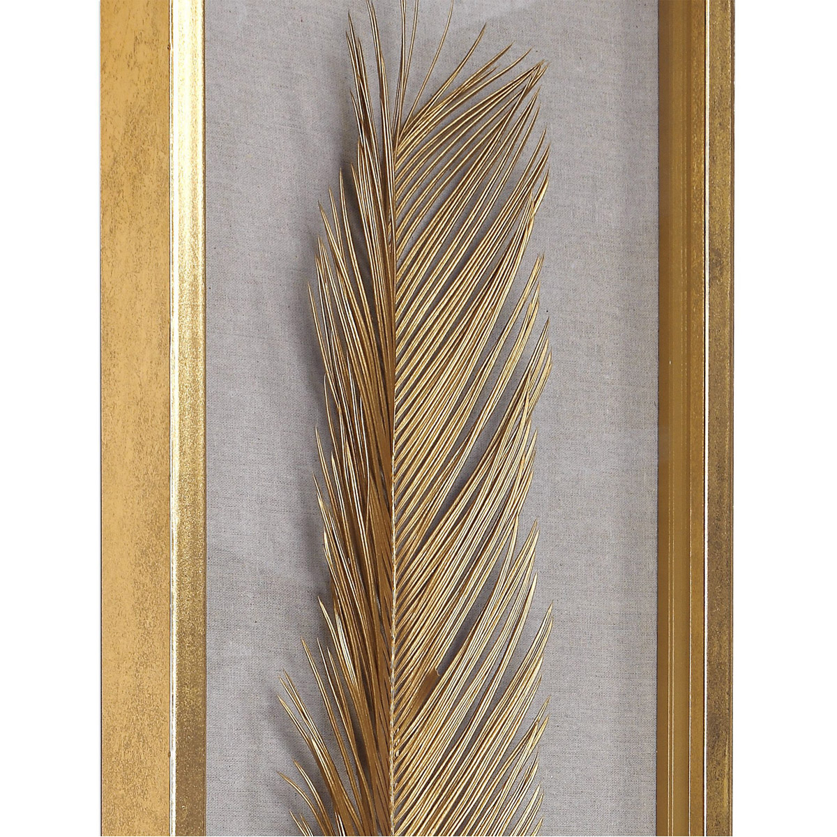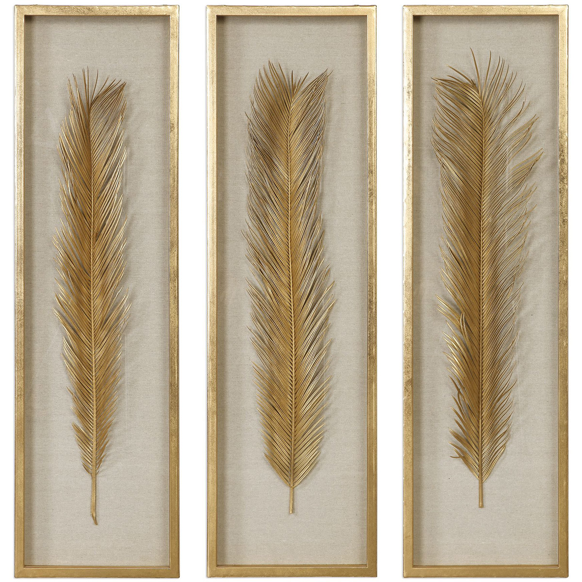 This Set Of 3 Shadow Box Art Features Gold Finished Sago Palm Leaf Replicas, Set On A Neutral Linen Background With Hand Applied Gold Leaf Frames.