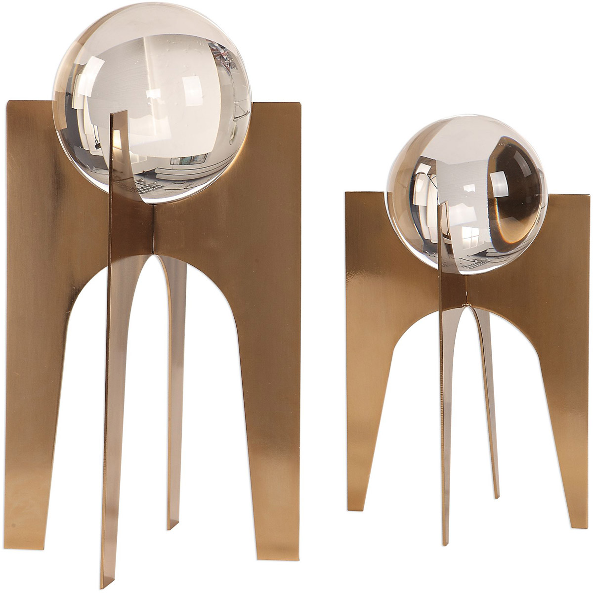 Crystal Spheres Elevated On Stainless Steel Bases Finished In A Brushed, Plated Copper Bronze. Sizes: Sm-6x10x6, Lg-7x16x7