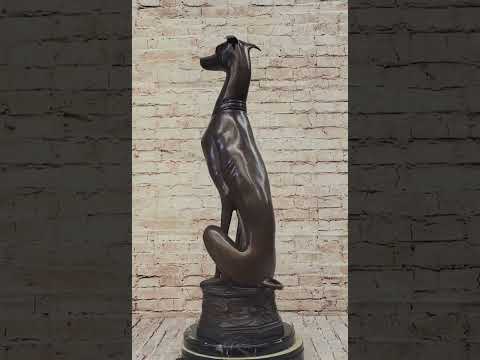 This bronze sculpture beautifully portrays the essence of a Greyhound, known for its docile nature and grace. The artist skillfully captured the dog's demeanor as it cowers, gently tucking its tail between its legs, while its eyes convey a sense of concern and pleading. This lifelike depiction highlights the breed's elegance and gentle demeanor, making it a captivating piece for any art lover or dog enthusiast.Crafted using the ancient lost-wax casting technique, this handmade bronze sculpture reflects the artist's dedication to capturing intricate details and emotions. The brown patina finish adds depth and character to the sculpture, enhancing its realistic appearance and ensuring long-term preservation. Resting on a sleek black marble base, this artwork is not only visually striking but also showcases the artist Moigniez's signature, adding a touch of authenticity and prestige to the piece.Whether displayed in a home, office, or art gallery, this Greyhound bronze sculpture is sure to evoke admiration and appreciation. Its combination of artistry, craftsmanship, and symbolic portrayal of the Greyhound's gentle nature makes it a timeless addition to any collection, inviting viewers to marvel at its beauty and storytelling.