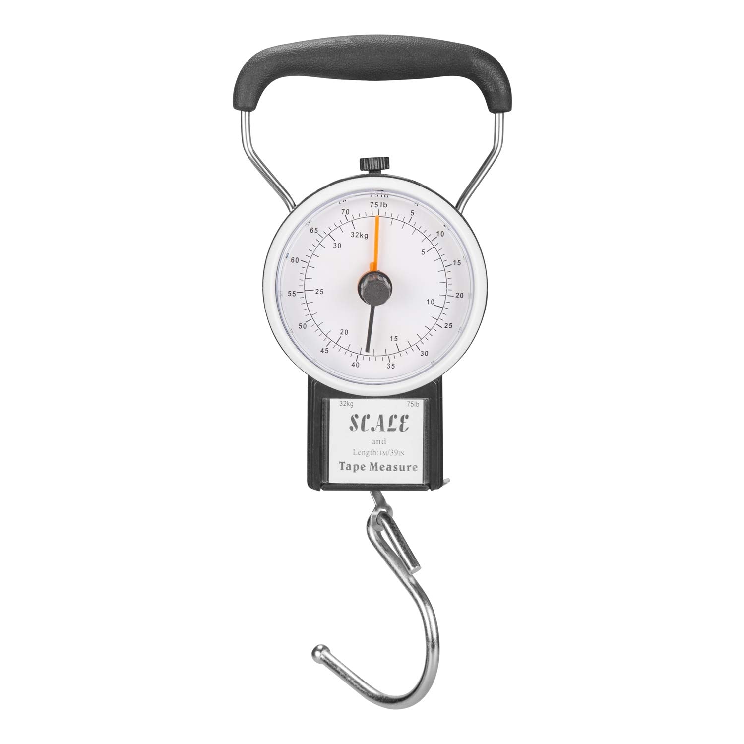 - Scale weighs up to 75 lbs. Tape measure extends to 39". Travel Suitcace Luggage Bag Balance Weight Scale.
