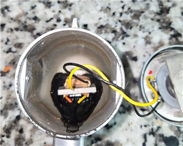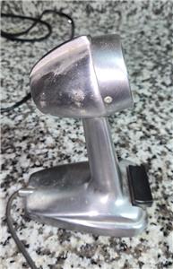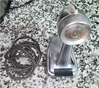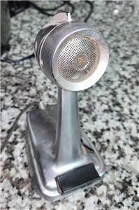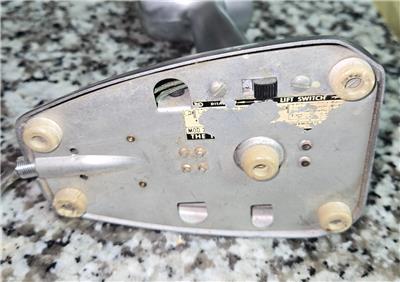 I tested it through a guitar amp, but plug I think is the old slightly smaller than 1/4". Label with the brand and model is mostly missing. Has a switch for the button on the bottom. Great for prop or project.