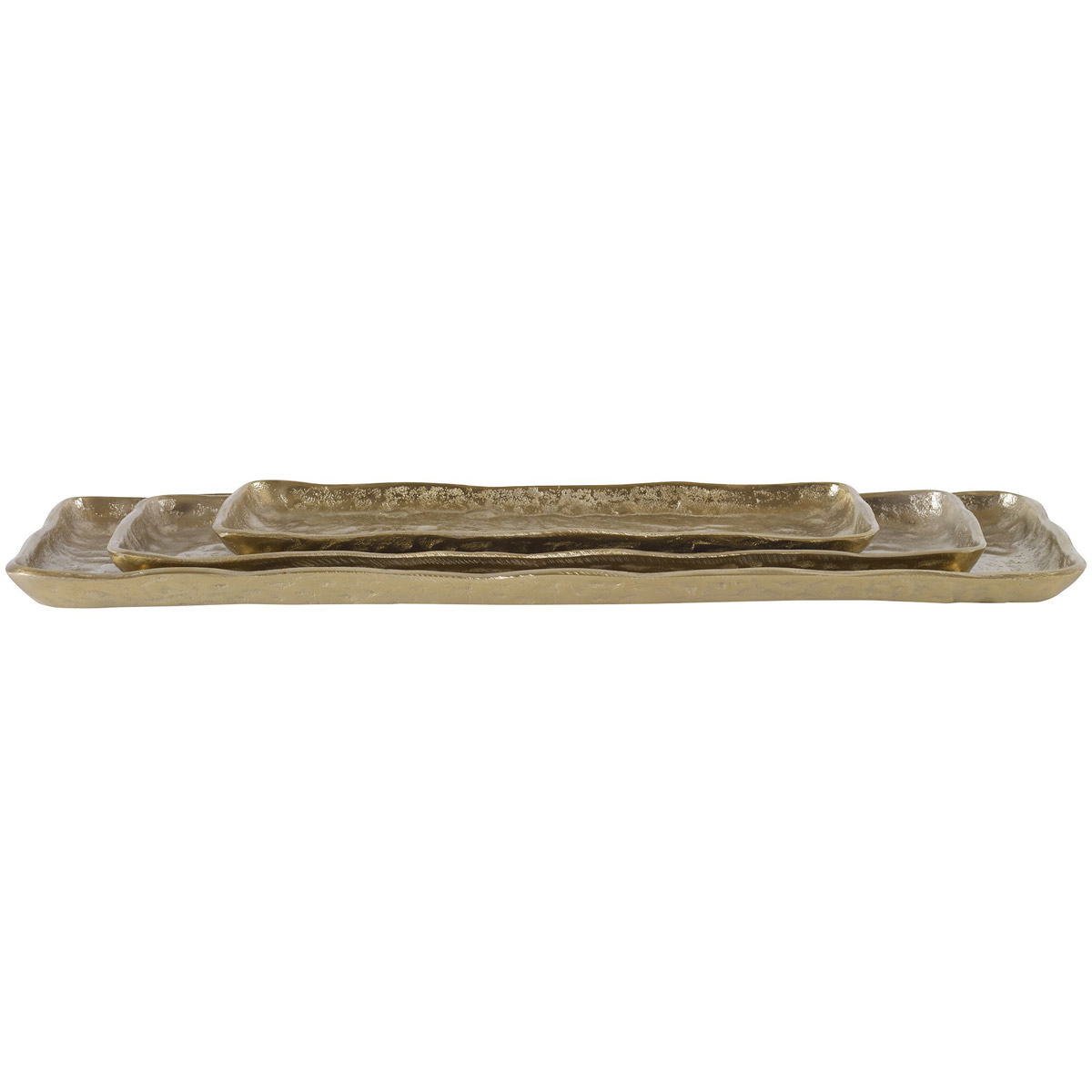 Set Of Three Cast Aluminum Trays Displays Organic Edges With A Heavily Textured Light Antique Gold Finish. Sizes: S-15x1x5, M-20x1x6, L-24x1x8