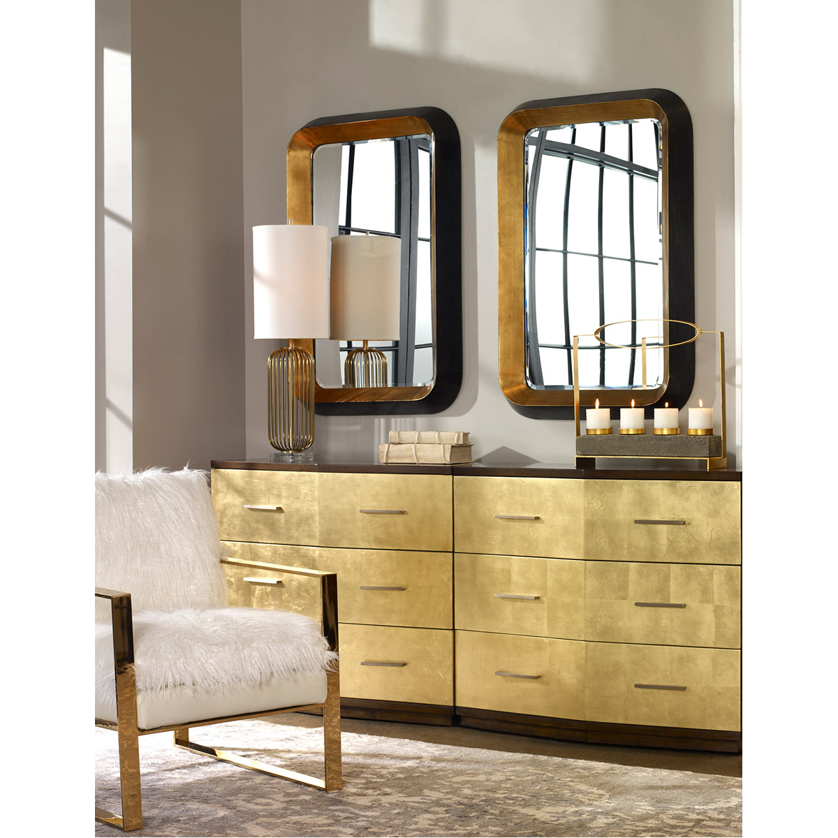 Deep forged iron with tapered sides finished in a lightly antiqued metallic gold leaf on the inside, and a heavily distressed black with gold undertones on the outside. Mirror has a generous 1-1/4" bevel. May be hung horizontal or vertical.