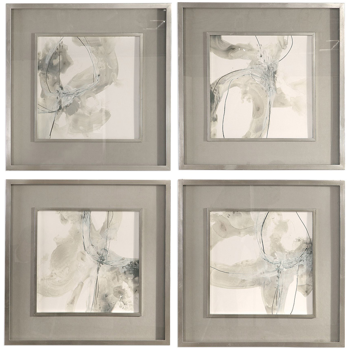 These Prints Feature Neutral Colors Of Warm Gray, Charcoal And Off-white Surrounded By Warm Gray Mats. Silver Leaf Frames And Fillets Complete The Artwork.