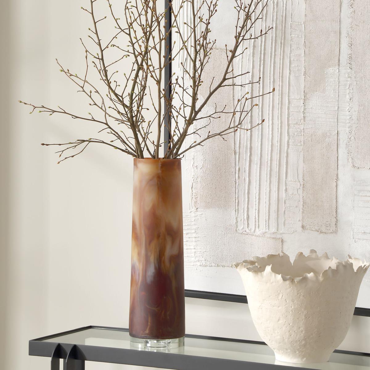 Crafted With Precision And An Eye For Detail, The Iced Mocha Vase Is More Than Just A Decorative Piece It's A Work Of Art That Elevates Your Interior Design. The Earthy Tones Of Caramel And Brown Create A Cozy And Inviting Atmosphere, While The Creamy Swirls Evoke A Sense Of Movement And Fluidity. All Perched On An Elegant Crystal Base. Glass Insert Included.