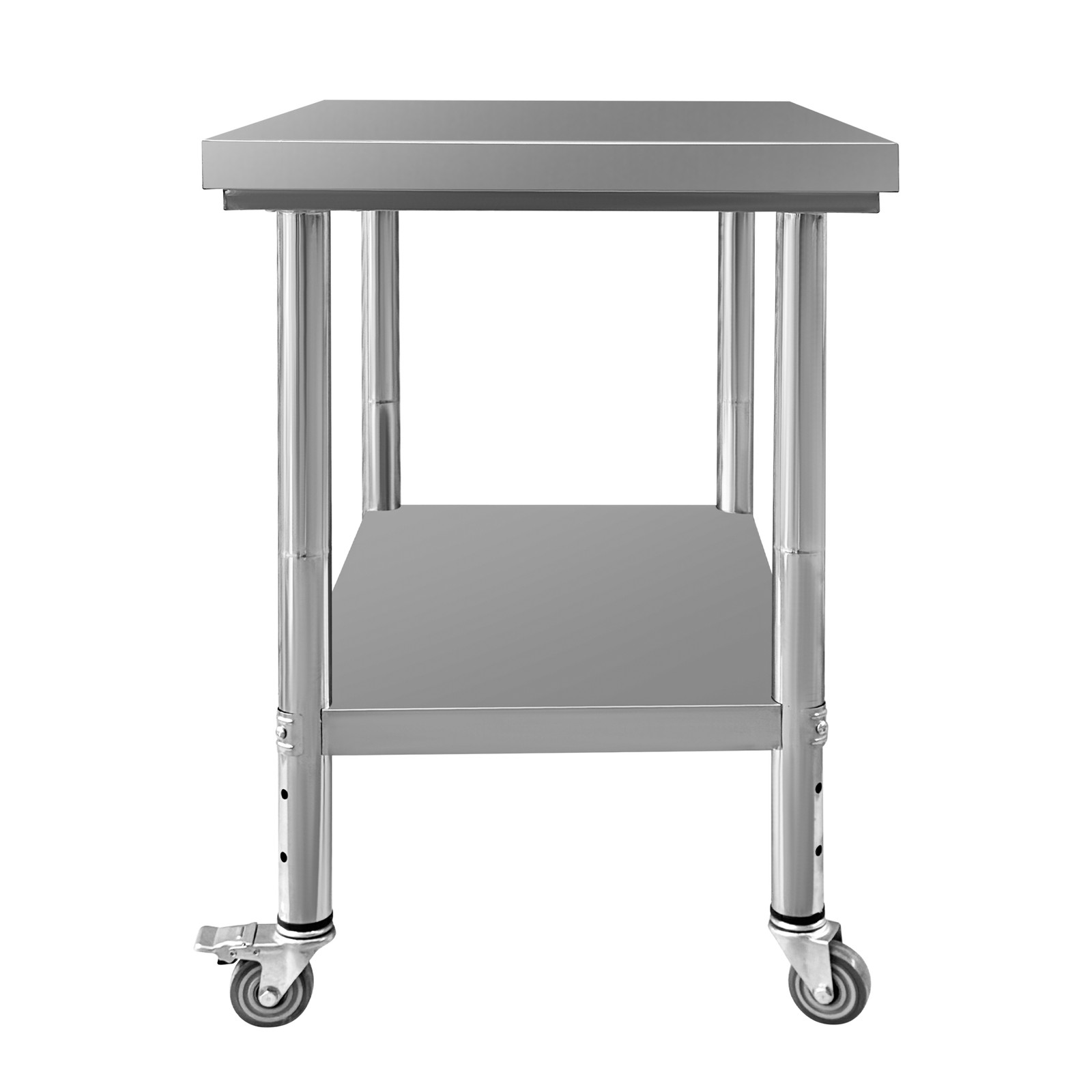 Convenient Movement: This stainless steel table has four 360 degrees rotating wheels, making turning the equipment possible. It is made of non-marking polyurethane rubber; these caster wheels are very quiet and smooth while rolling. In addition, two wheels have brakes, ensuring the table remains still at any time.