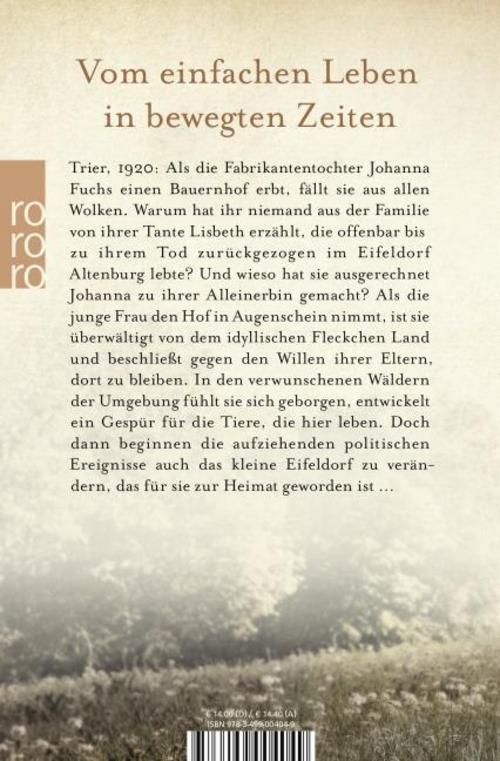 Trier, 1920: Als die Fabrikantentochter Johanna Fuchs einen Bauernhof erbt, fällt sie aus allen Wolken. Warum hat ihr niemand aus der Familie von ihrer Tante Lisbeth erzählt, die offenbar bis zu ihrem Tod zurückgezogen im Eifeldorf Altenburg lebte Und wieso hat sie ausgerechnet Johanna zu ihrer Alleinerbin gemacht Als die junge Frau den Hof in Augenschein nimmt, ist sie überwältigt von dem idyllischen Fleckchen Land und beschließt gegen den Willen ihrer Eltern, dort zu bleiben. In den verwunschenen Wäldern der Umgebung fühlt sie sich geborgen, entwickelt ein Gespür für die Tiere, die hier leben. Doch dann beginnen die aufziehenden politischen Ereignisse, auch das kleine Eifeldorf zu verändern, das für sie zur Heimat geworden ist ...