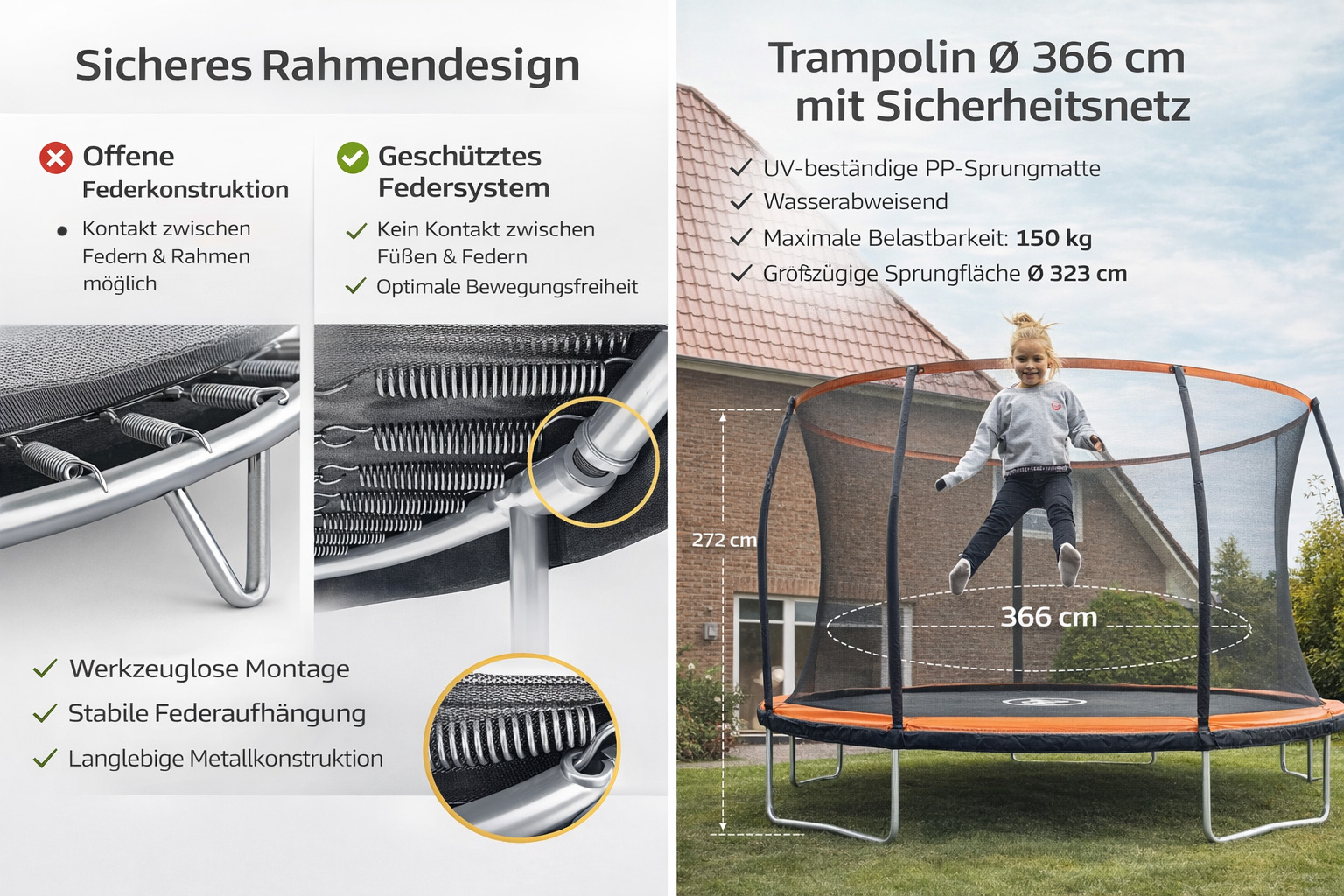 Ob für tägliche Fitnessübungen oder als abenteuerlicher Mittelpunkt im sommerlichen Garten – dieses Trampolin überzeugt durch Langlebigkeit, geprüfte Qualität und ein dynamisches Sprunggefühl, das Kinder und Erwachsene gleichermaßen begeistert.