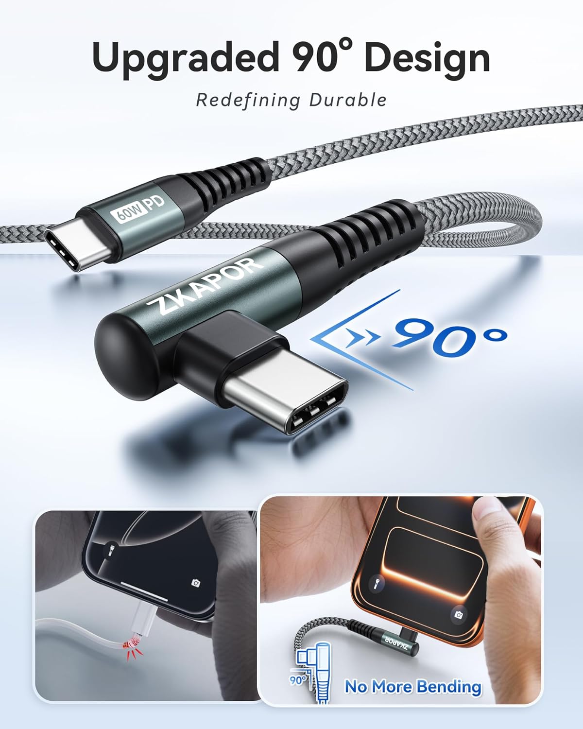 ZKAPOR Right Angle USB C to USB C Cable with a new 90-degree "L"-shaped design. It's user-friendly design more convenient and comfortable for playing games, watching videos, reading e-books when you charging. Make people have a pleasant experience of use.