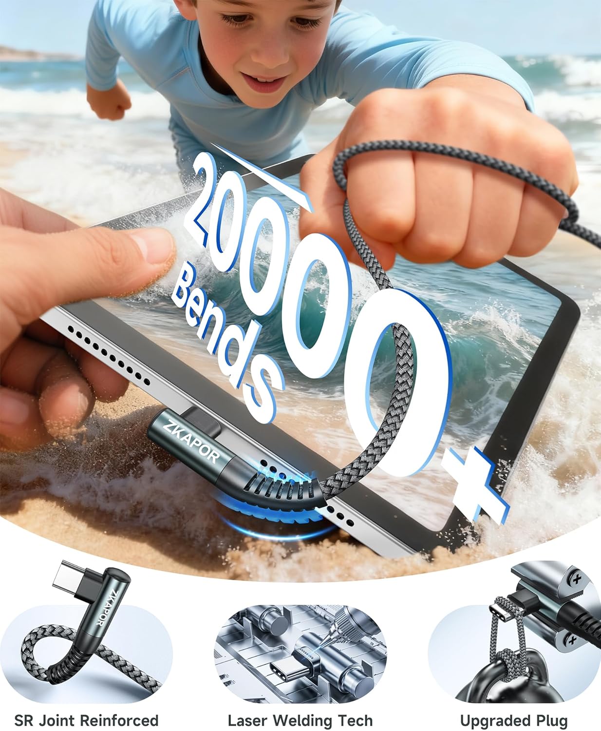 ZKAPOR Type C to Type C Cable is braided with advanced double-layer nylon material and featuring a reinforced 90-degree connectors, which can withstand up to 20000+ bends,with tensile strength to withstand 15KG. The 90-degree "L" shape design avoids frequent bending of the cable and protects the cable from breaking easily.