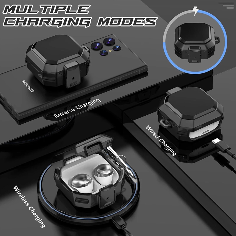 【Materials and Protection】: This cover is made of rugged military-grade hard PC material .The four corners are wrapped with a double-layer air cushion structure. Angle cushion technology protects your Galaxy Buds Live/Pro/2 charging case against bumps, drops and scratches etc.