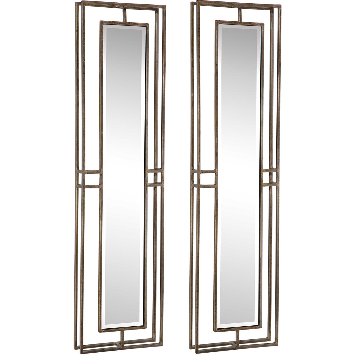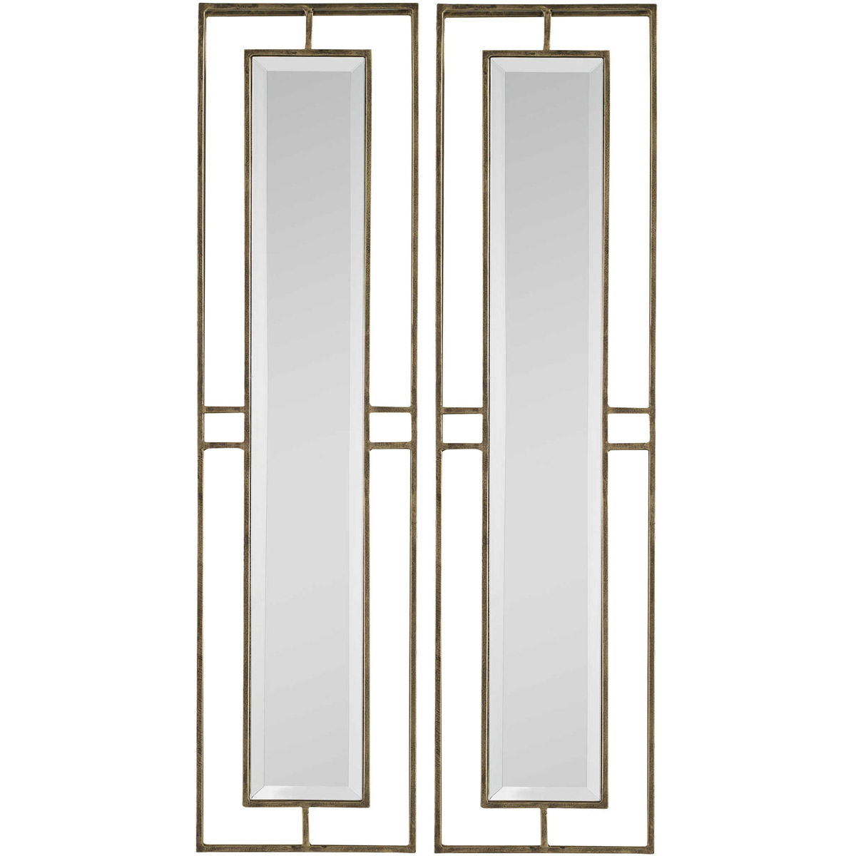 Clean and contemporary, each mirror exhibit linear metal frames with a nearly two inch open depth. Each frame is finished in a heavily antiqued gold, accented by slim beveled mirrors. May be hung horizontal or vertical.