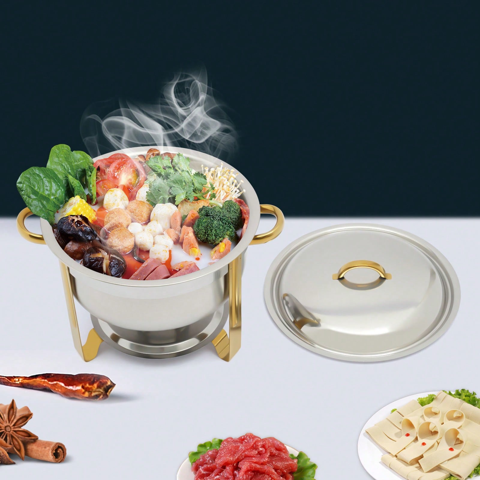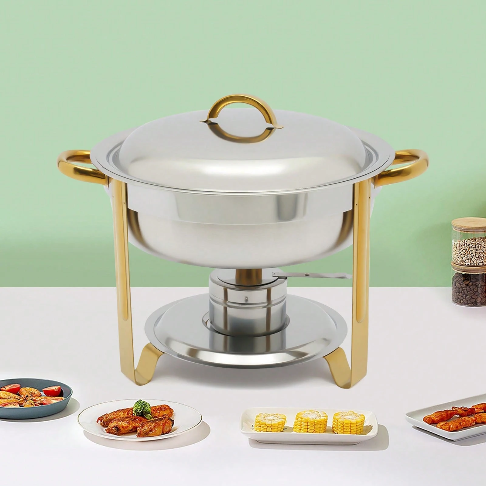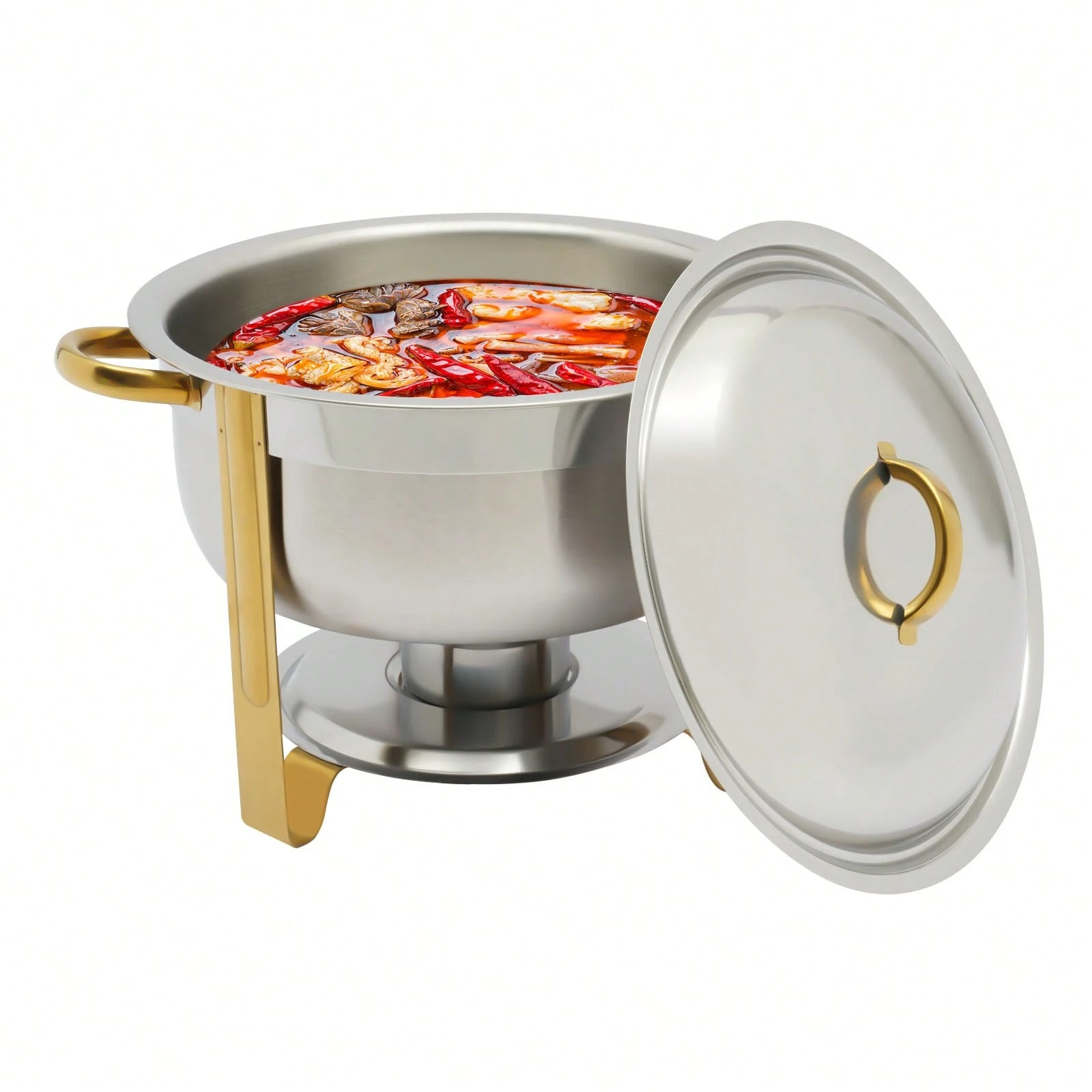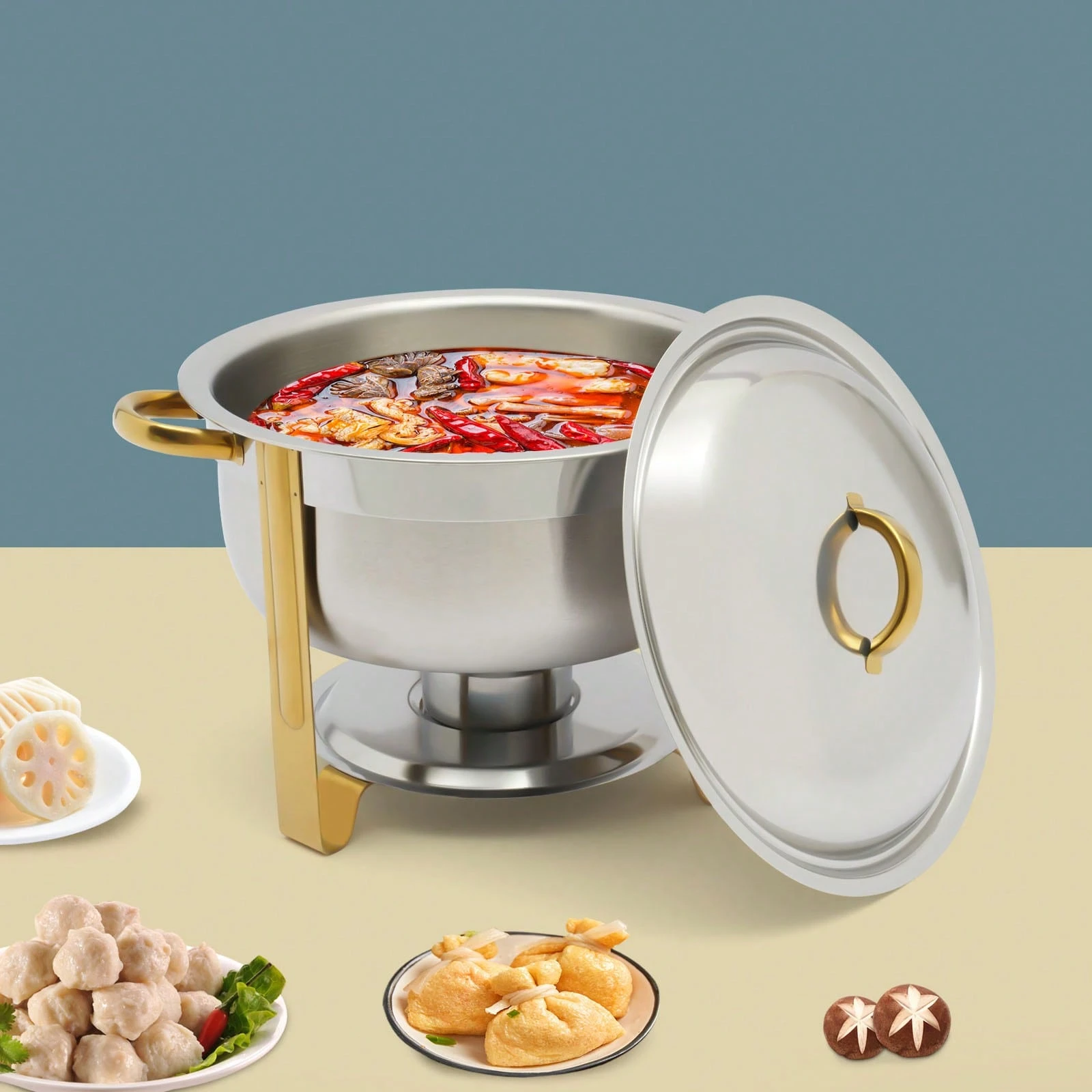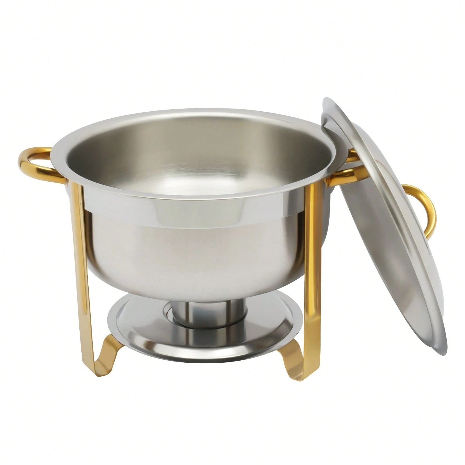 Der Edelstahl Chafing Dish mit einem Fassungsvermögen von 5 Litern ist die perfekte Lösung für Buffet und Catering. Mit seinem eleganten goldenen Finish ist er nicht nur funktional, sondern auch ein echter Blickfang auf jedem Tisch. Dieser vielseitige Wärmespeicher eignet sich ideal für die Warmhaltung von Speisen bei Veranstaltungen, Feiern oder im Gastronomiebereich. Sein robustes Material sorgt dafür, dass die Speisen gleichmäßig und zuverlässig warmgehalten werden, während die runde Form eine ansprechende Präsentation ermöglicht.
