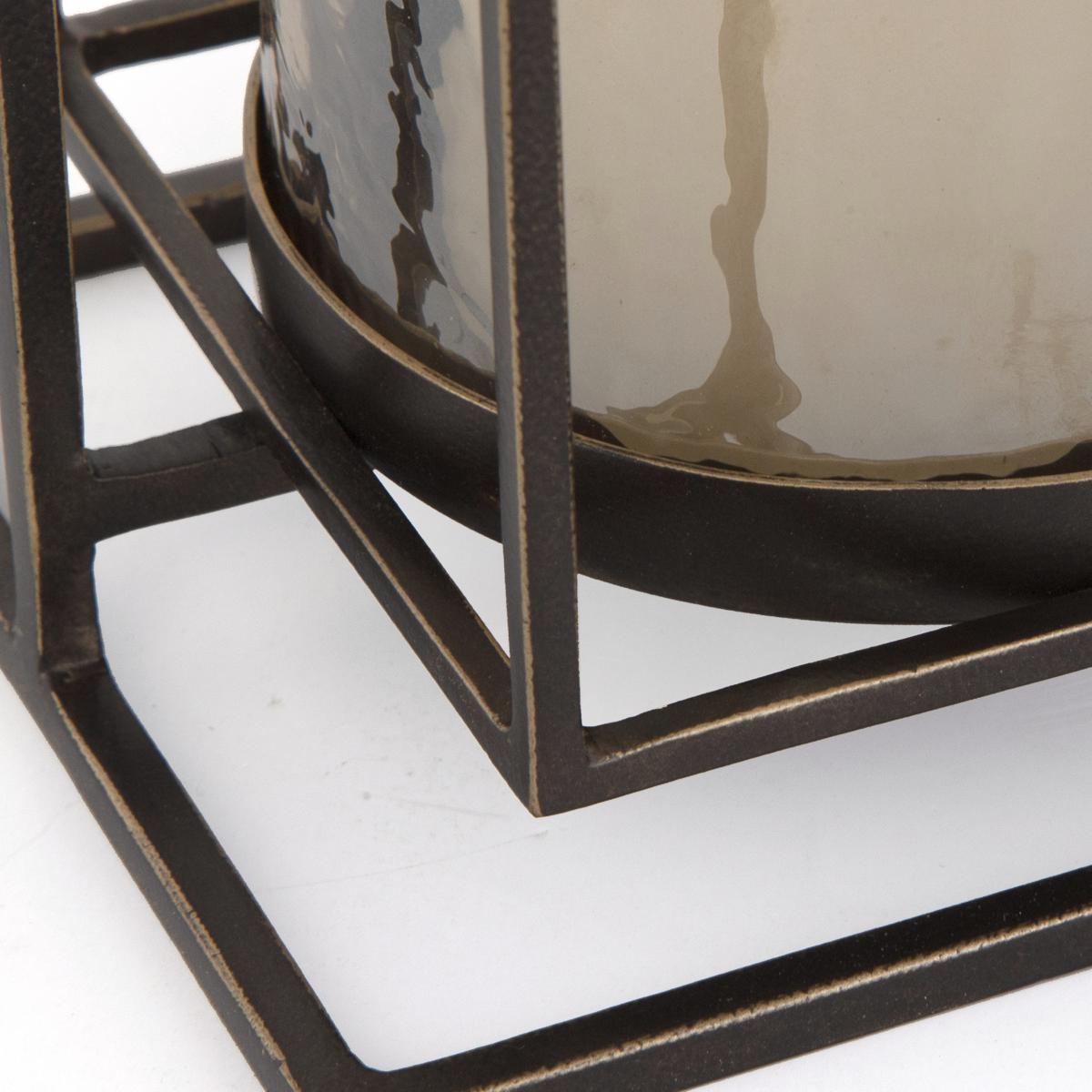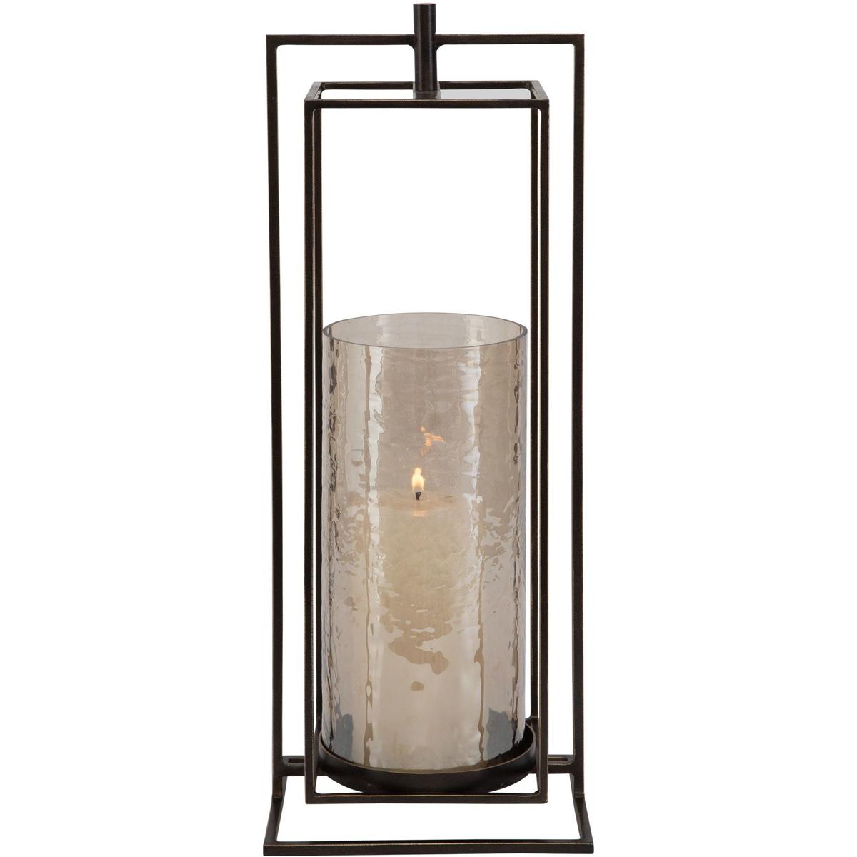 Illuminate Your Space With A Warm Glow From This Textured Glass And Iron Candle Lantern. Designed To Hold A Pillar Candle, It Features A Removable Textured Glass Hurricane And Iron Stand Finished In Dark Bronze With Gold Rub-through Details. One White 3"x 5" Candle Is Included.