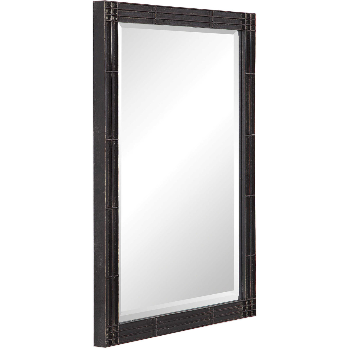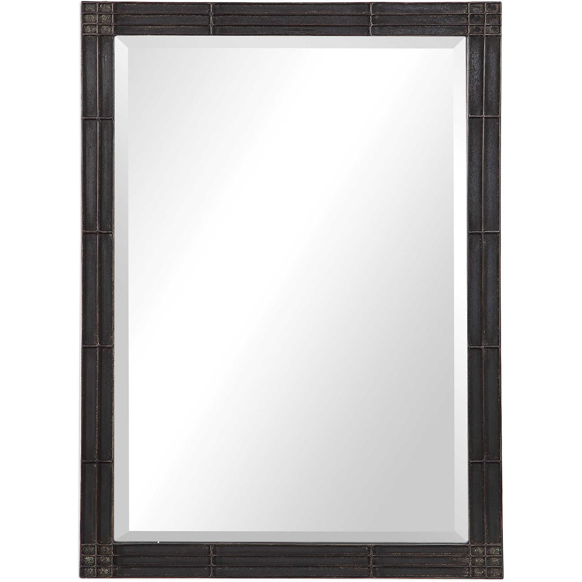 Crafted From Hand Forged Iron, This Rectangular Mirror Features Raised Geometric Detailing Finished In A Rustic Aged Black With Subtle Silver Highlights And A Gray Patina Wash. The Mirror Is Surrounded By A Generous 1 1/4" Bevel And May Be Hung Horizontal Or Vertical.