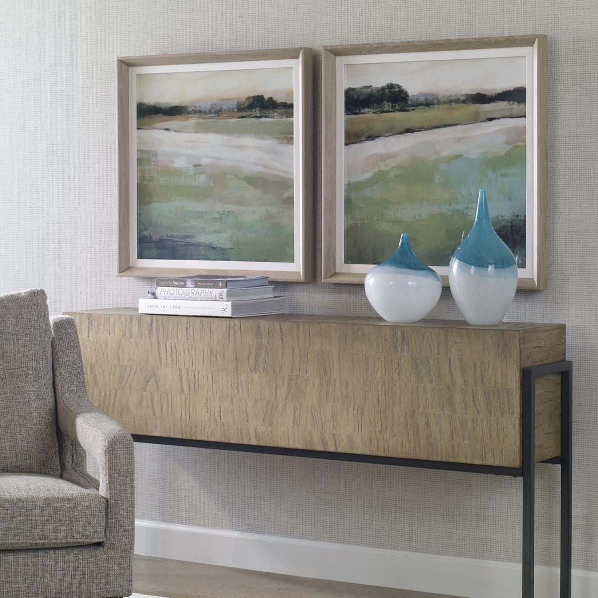 Depicting A Serene Landscape, This Set Of Two Prints Uses Neutral Tones Paired With Varying Green Shades From Deep Emerald To Chartreuse. Each Print Is Complemented By A Natural Linen Liner And A Pine Wood Frame With A Light White Wash. Artwork By Paul Duncan.