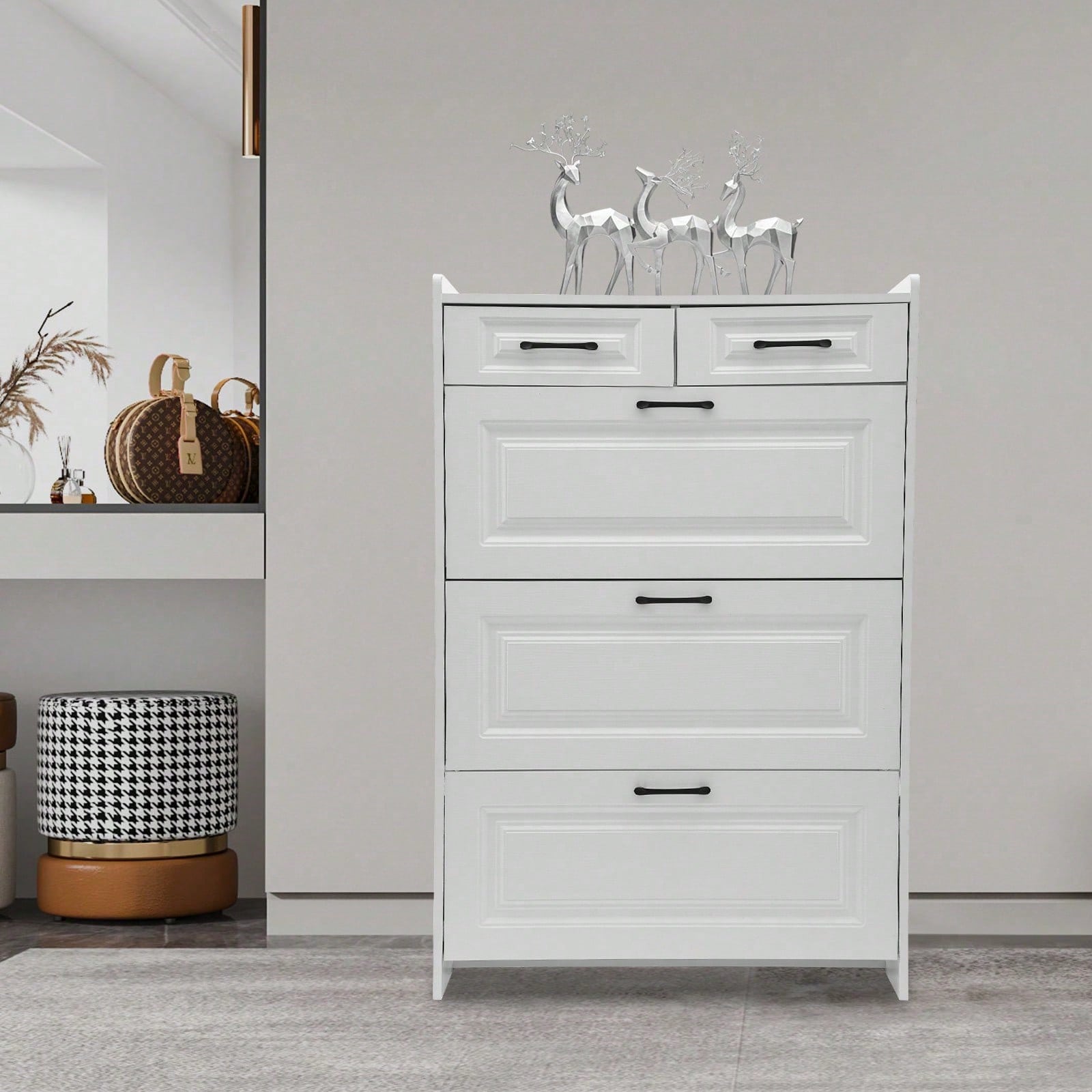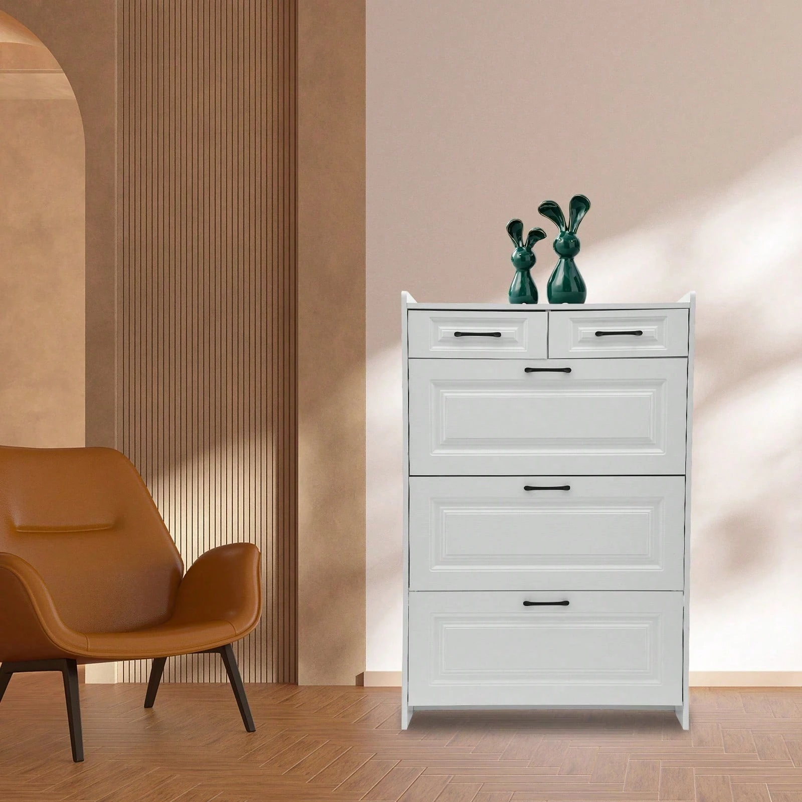 Der Slim White Switch Schuhschrank vereint modernes Design mit praktischer Funktionalität und ist ideal für kleine Wohnungen. Mit seinen 3 großen Flip-Flop-Schubladen und 2 zusätzlichen Aufbewahrungsschubladen bietet er ausreichend Platz für Ihre Lieblingsschuhe und sorgt für Ordnung im Flur oder Eingangsbereich. Das hochwertige WPC-Material in eleganter Weißoptik fügt sich harmonisch in jedes Wohnambiente ein und verleiht Ihrem Zuhause einen frischen, modernen Look.