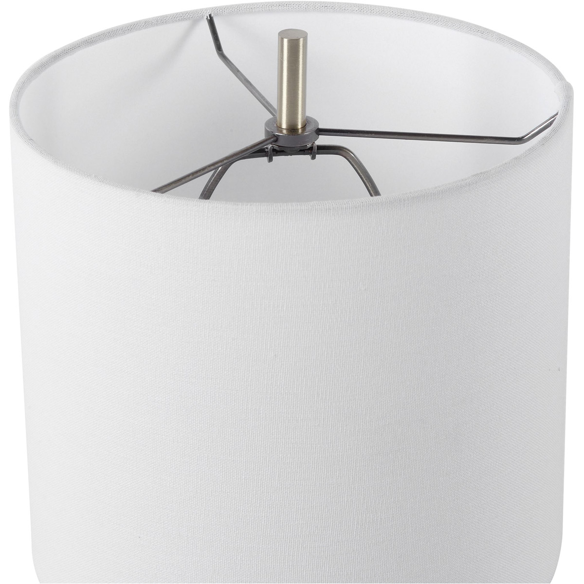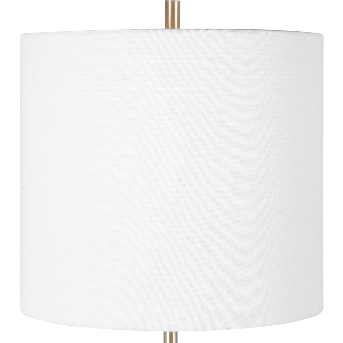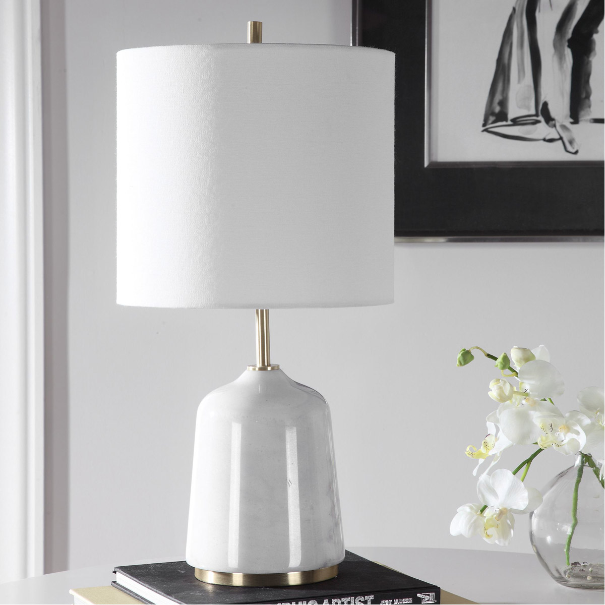 This Elegant Table Lamp Showcases A Thick White Marble Base With With Subtle Gray Veining, Accented With Brushed Light Brass Plated Details. The Lamp Is Paired With A White Linen Fabric, Round Drum Shade.