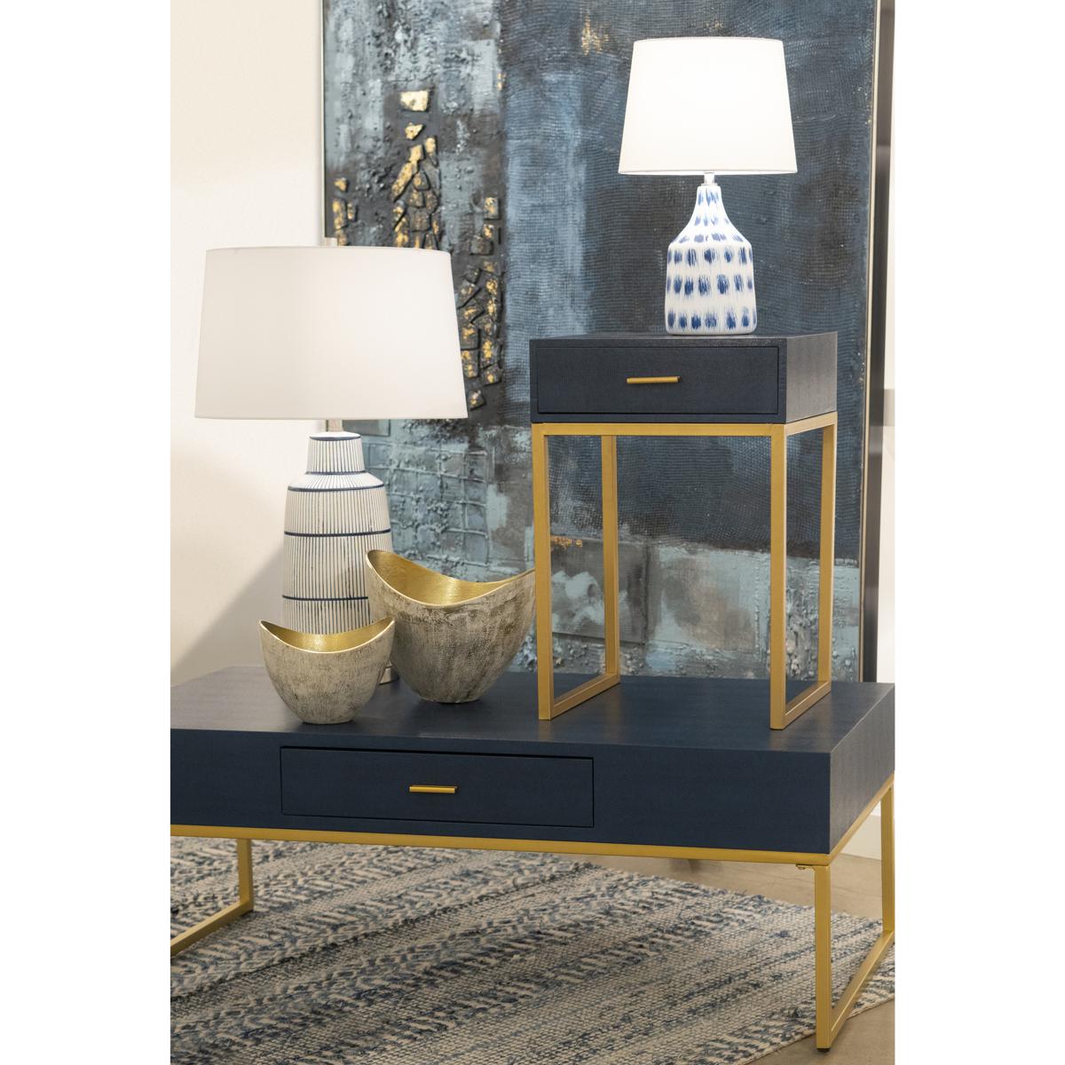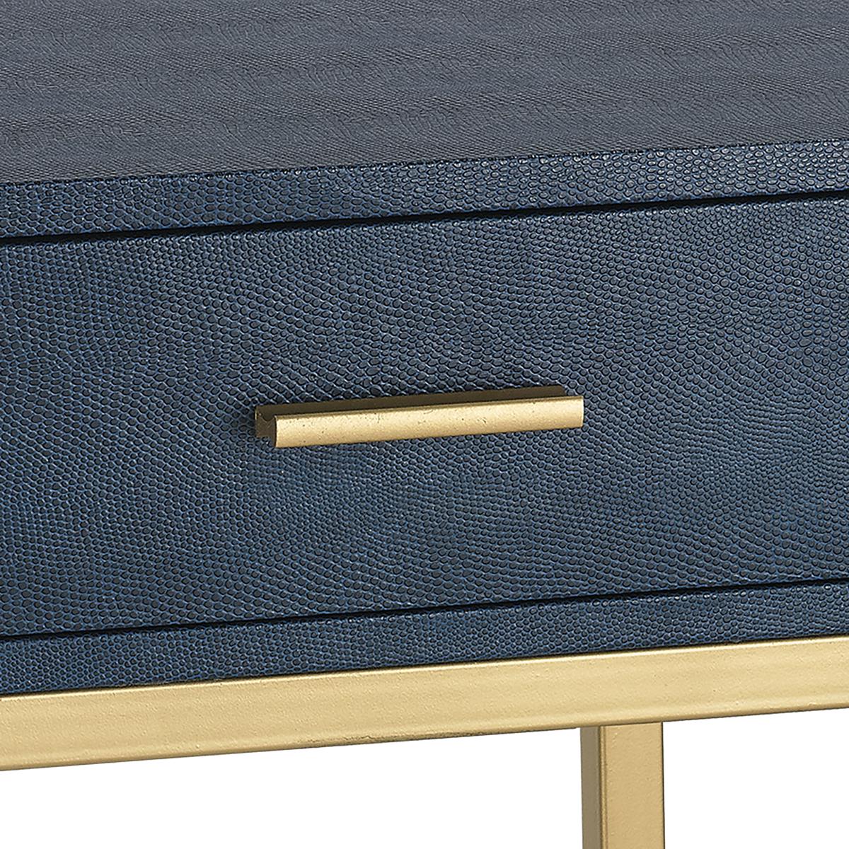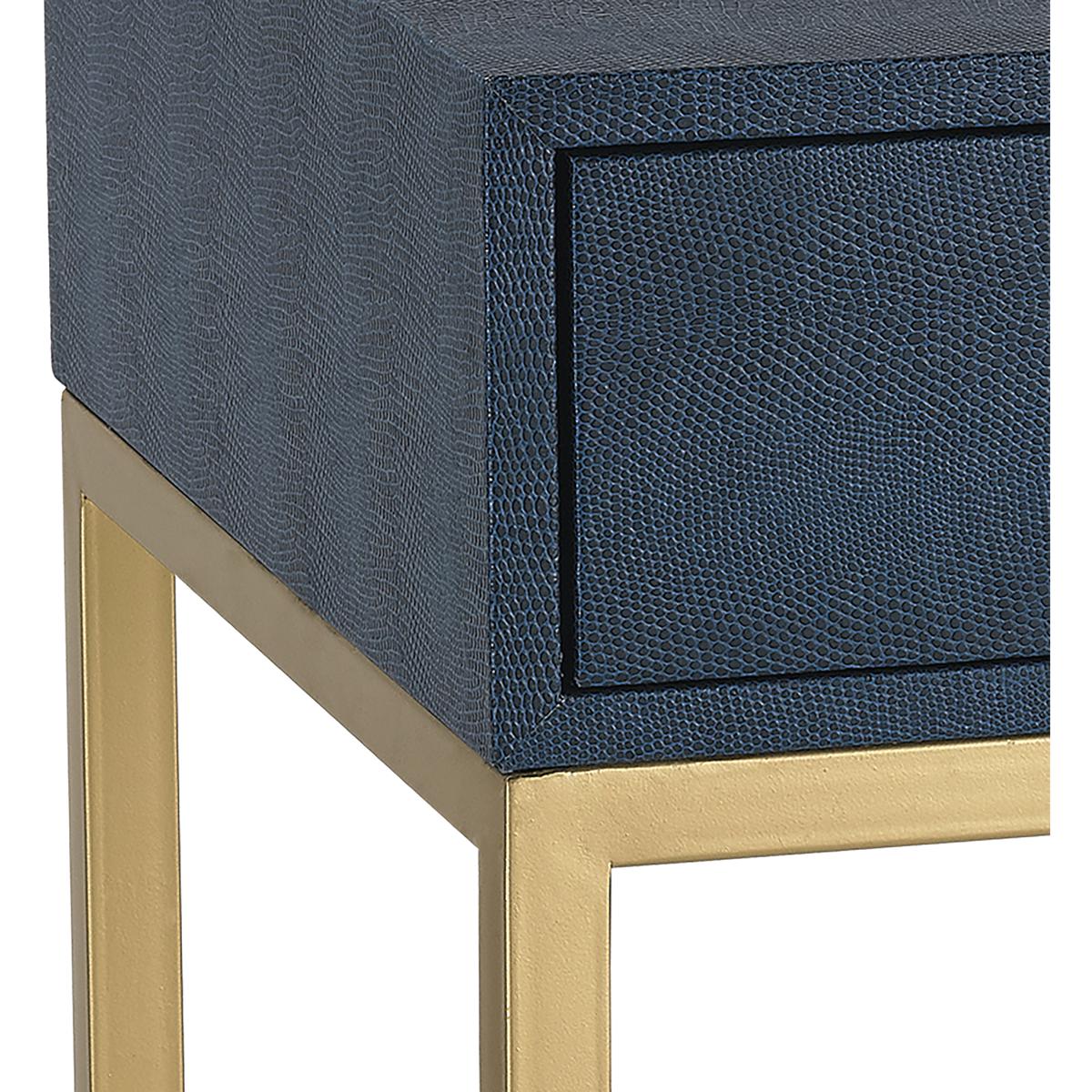 The Shagreen Accent Table is a square side table with a single drawer and open frame base. The top with drawer is wrapped in grey faux shagreen. The open sided frame means that this useful storage space is not overbearing within a space, making it perfect for a bedside or sofa side table.