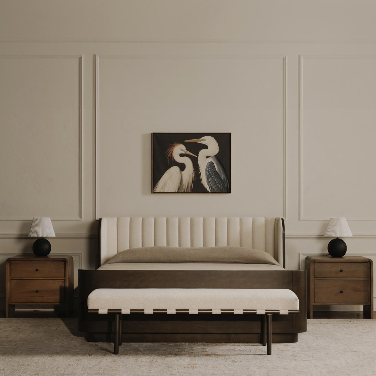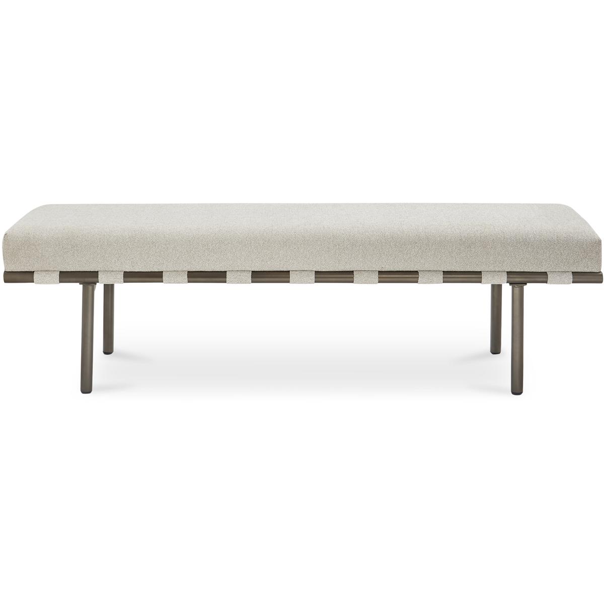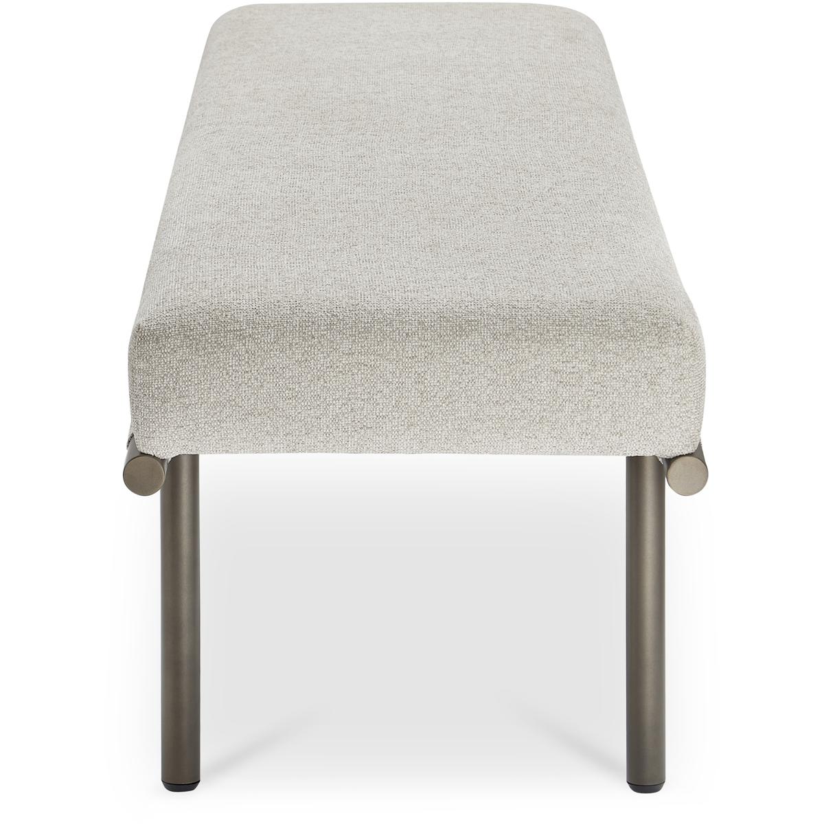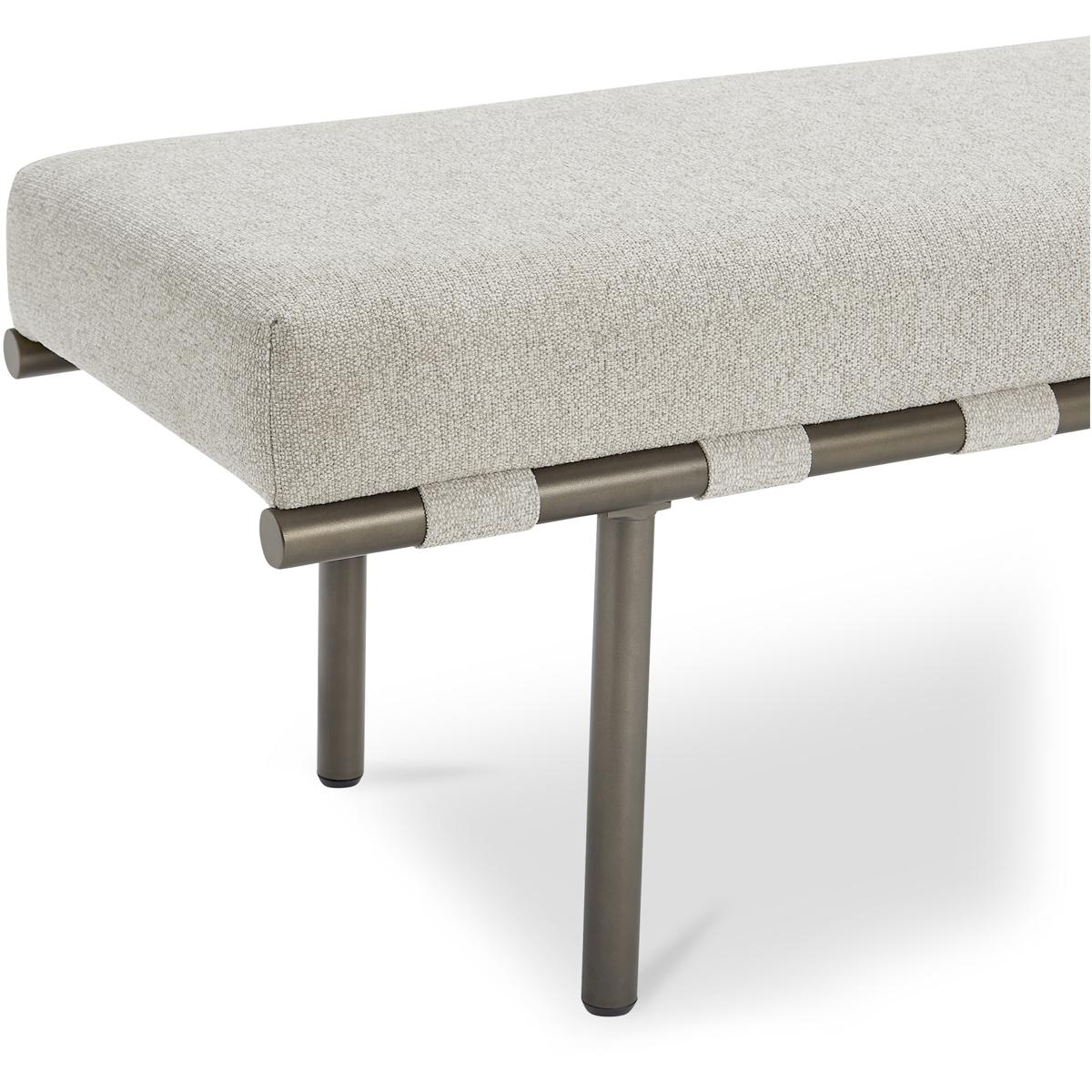The Carson dining bench features elegant fabric segments over a striking blackened bronze-finished metal frame. Able to complement tables of 70 to 80 inches yet able to transition to living spaces gracefully, its fusion of Performance fabric and foam padding merges comfort with durability.