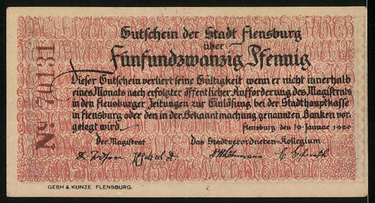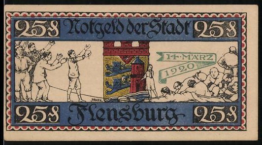 Notgeld Flensburg 1920, 25 Pfennig, Demonstranten vor Tor mit Stadtwappen und Datum 14. März 1920