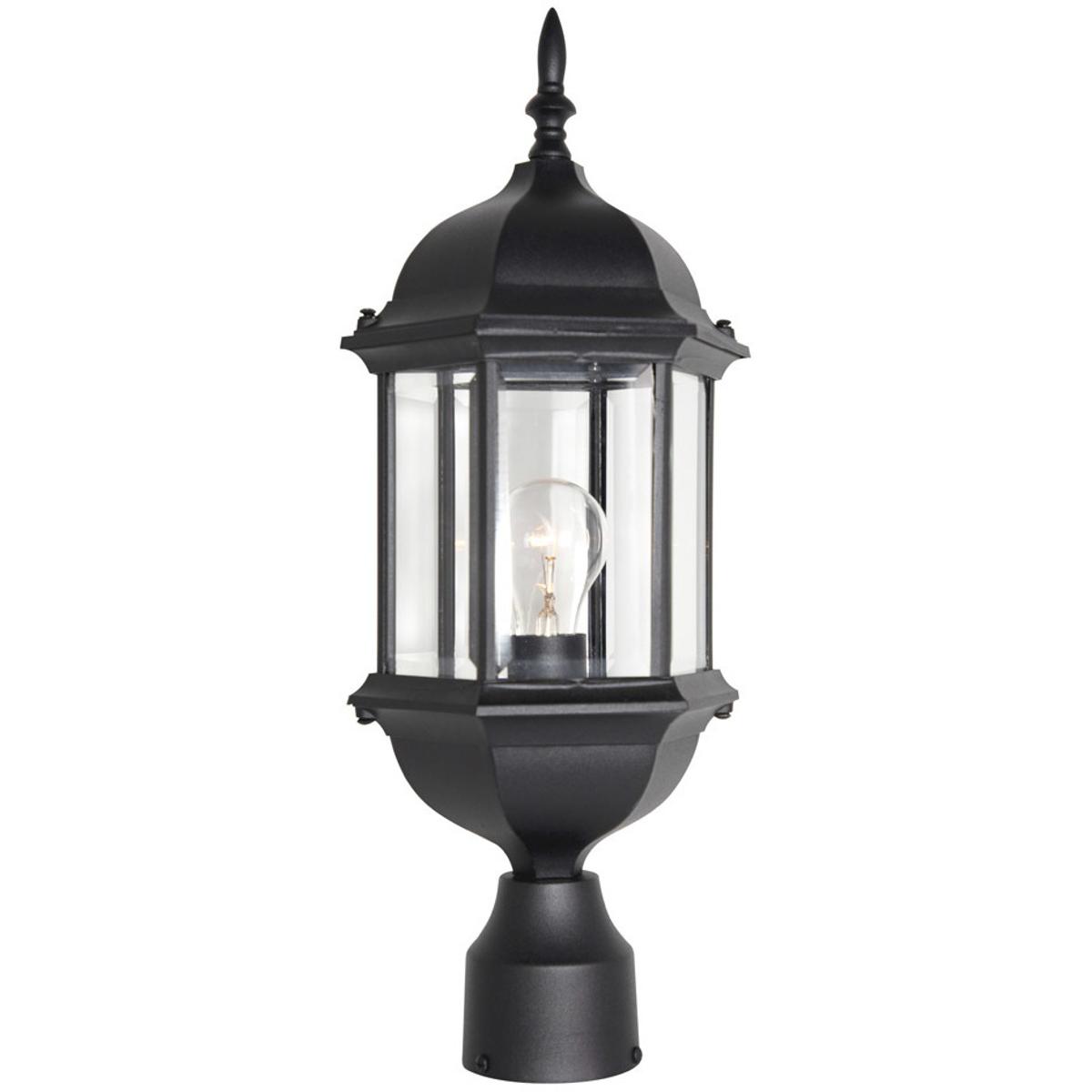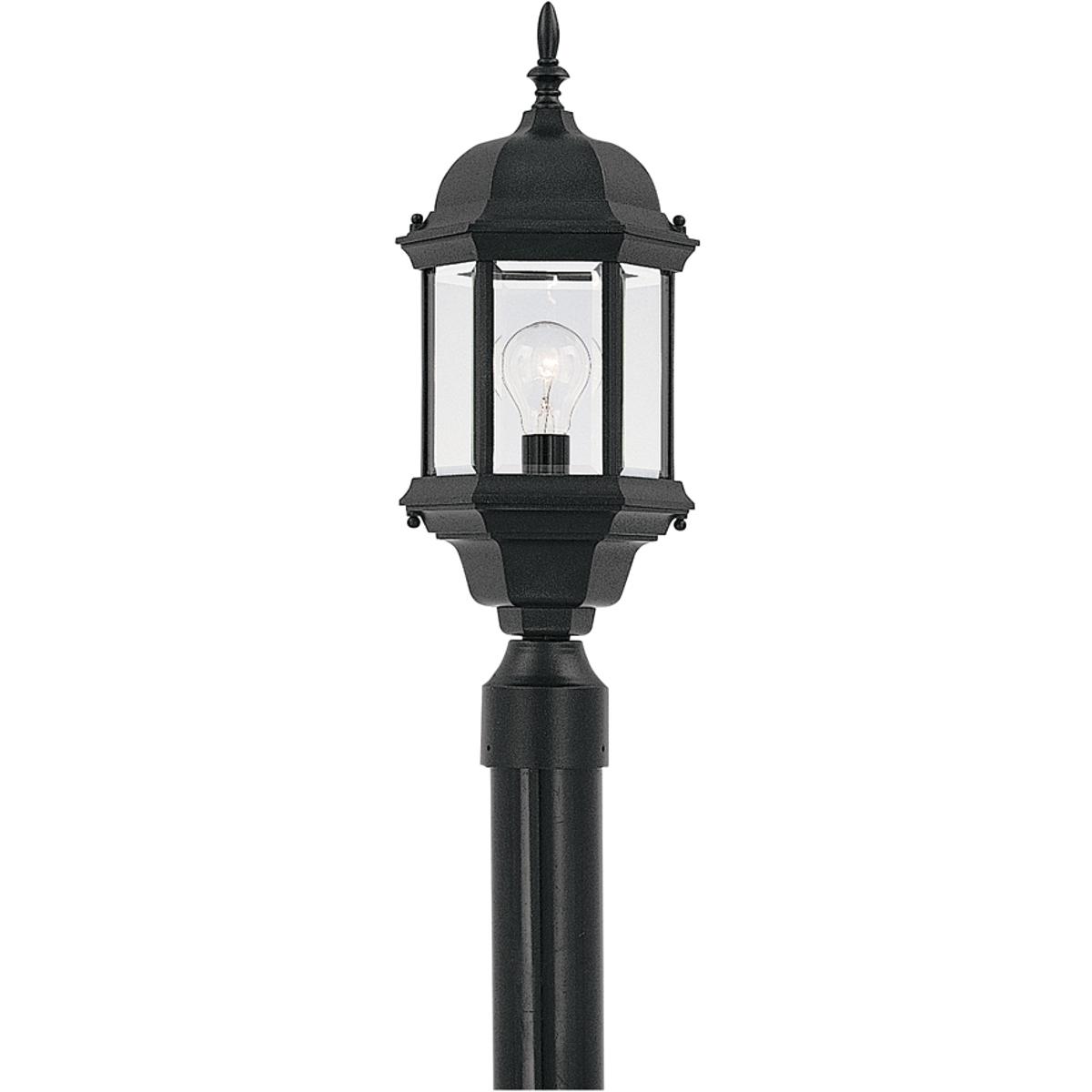 Erving outdoor post lanterns feature an elegant 6 sided design with a bold arm and exquisite detailing that complements the decor of any home. The clear glass works with the finish and detailing to provide a classic look from the fixture and a warm glow from the light. The solid black finish is treated to prevent pitting, tarnishing, corrosion, and discoloration. The sturdy, weather resistant cast aluminum construction and waterproof seal protect the lantern from harsh outdoor elements to ensure the long life of the fixture. These outdoor post lanterns install easily and deliver welcoming, safe and reliable exterior lighting. Cast aluminum six-sided lanterns with clear beveled glass panels.
