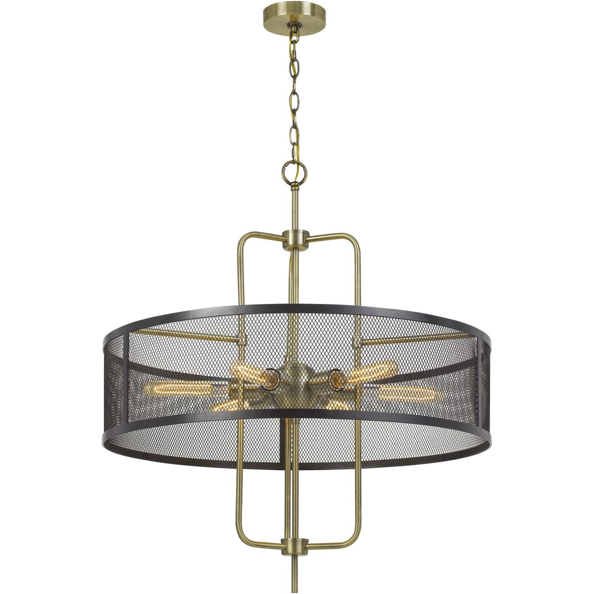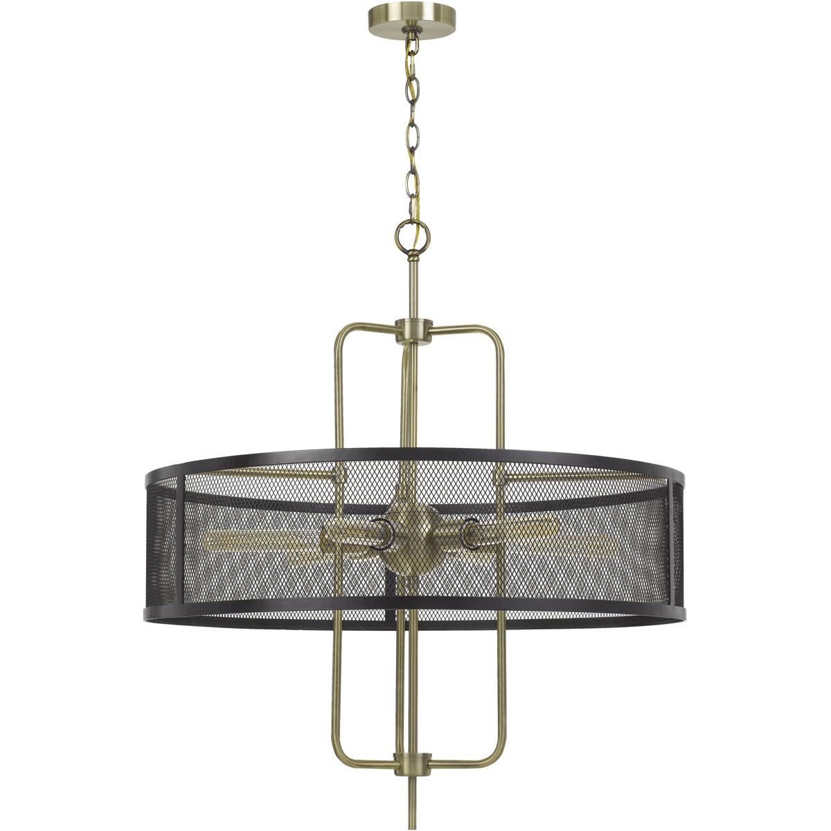Update your space with this antique brass and black finish six light metal chandelier. It features a sputnik design with a circular mesh shade. The chandelier ships complete with six foot chain and canopy.