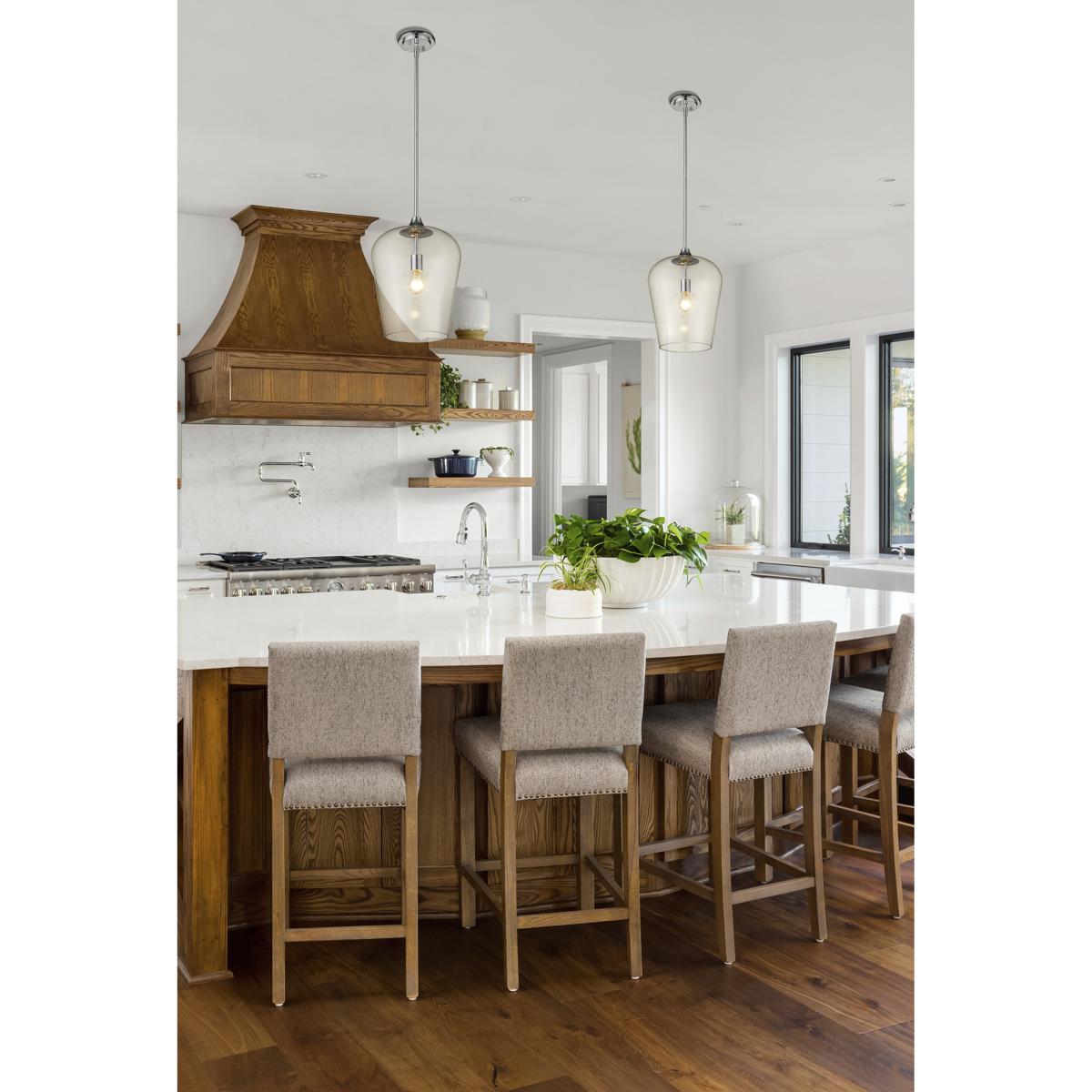 Sheer sophistication invokes a silhouette mimicking an inverted goblet, turning this one-light pendant into a solid choice for an ultra-modern, custom kitchen, bedroom, or living area. Choose this exquisite pendant from the Joliet collection, admiring its Bordeaux clear glass shade that embellishes a radiant chrome finish down rod and round canopy and delivers a low-key yet high-class effect.