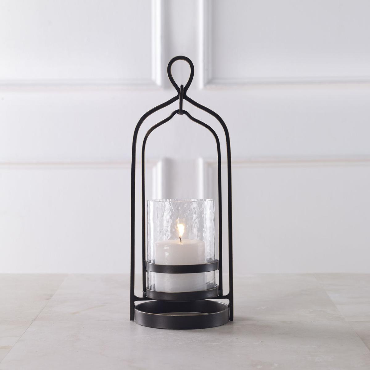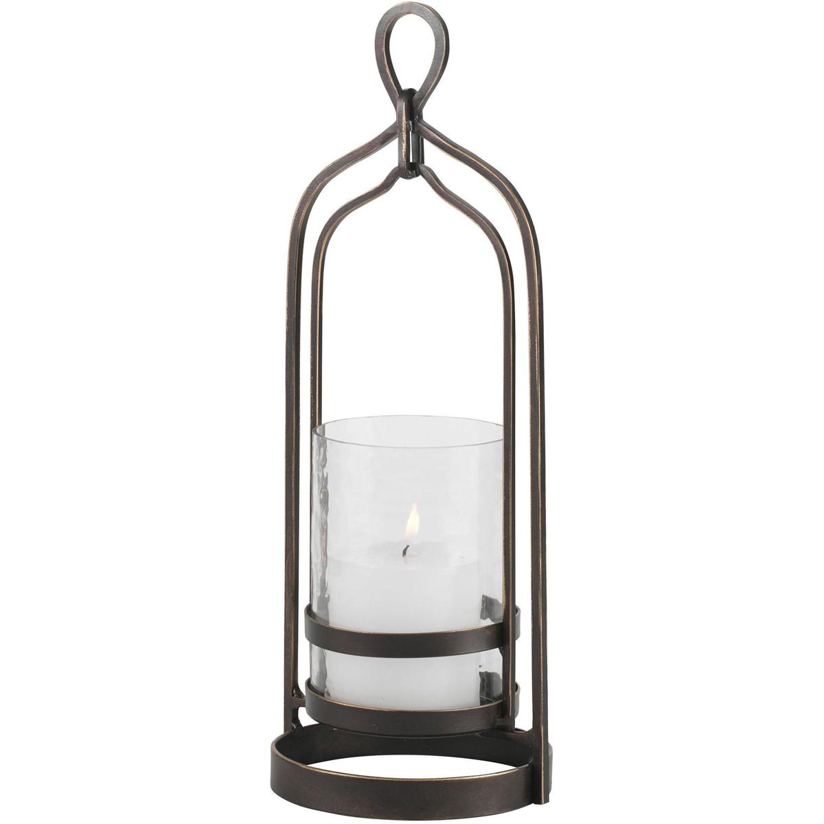 Taking Cues From Moroccan Style, This Candleholder Is Finished In Dark Bronze With Gold Rub-through Details And A Textured Glass Hurricane. One White 3"x 3" Candle Is Included.