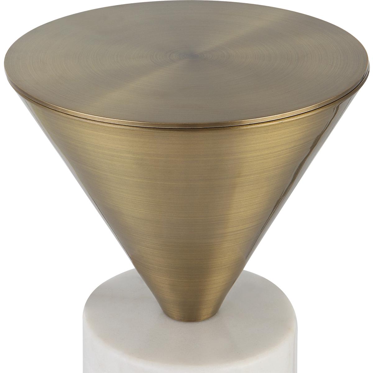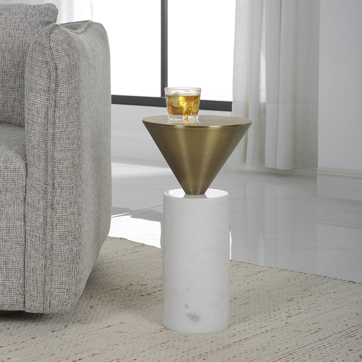 A Juxtaposition Of Modern Shapes, This Stylish Drink Table Features Solid White Marble Paired With A Luxurious Brushed Brass Steel Top. True To The Nature Of Natural Materials, Each Piece Will Have Unique Marbling And Veining Throughout.