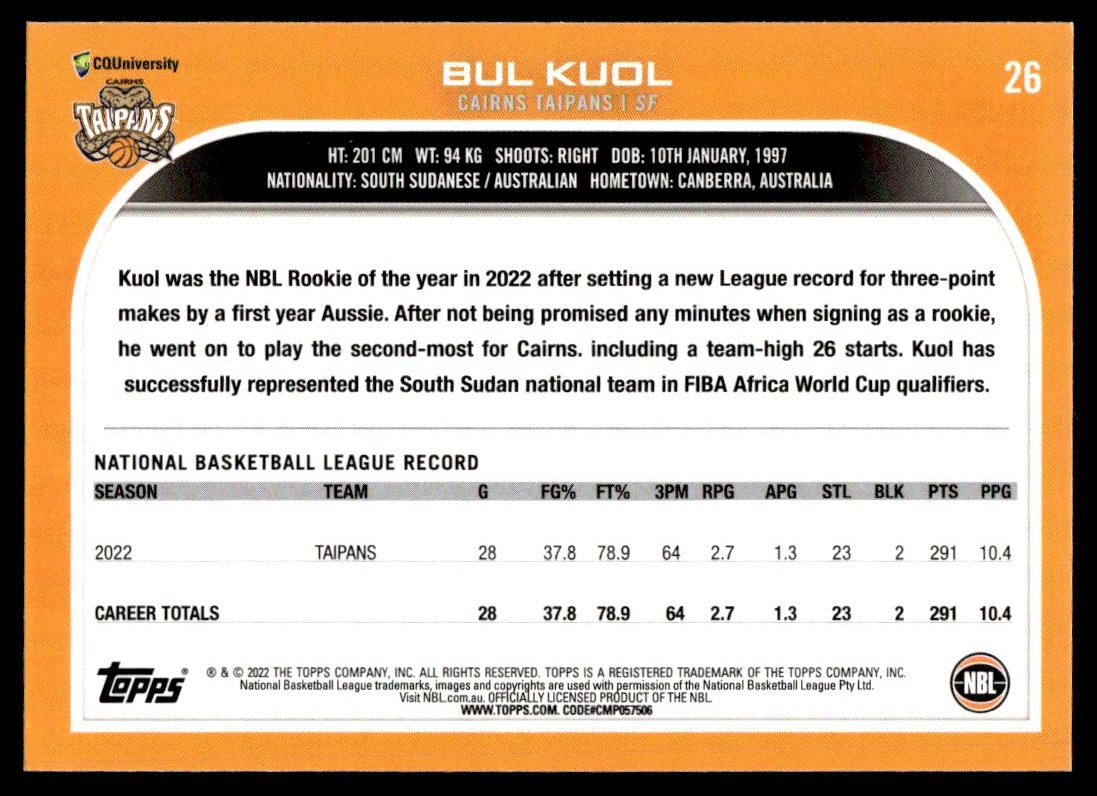| 2022-23 Topps NBL Bul Kuol Rookie Cairns Taipans #26 |