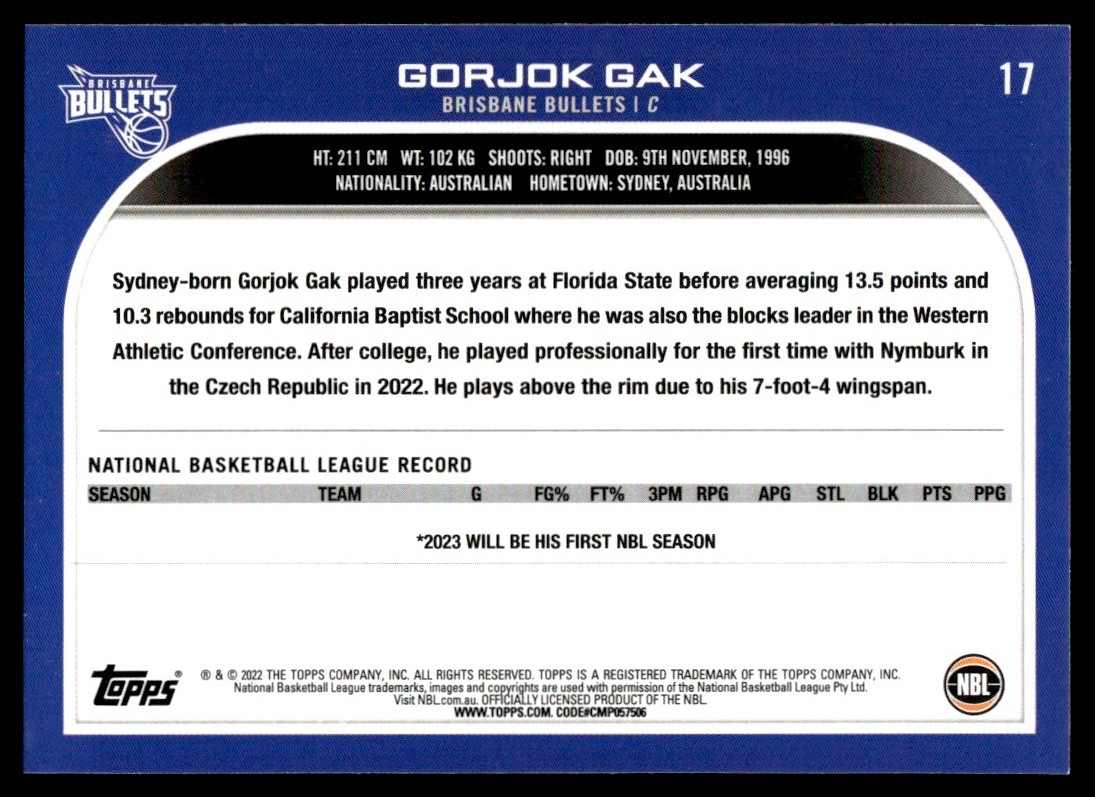 | 2022-23 Topps NBL Gorjok Gak Rookie Brisbane Bullets #17 |