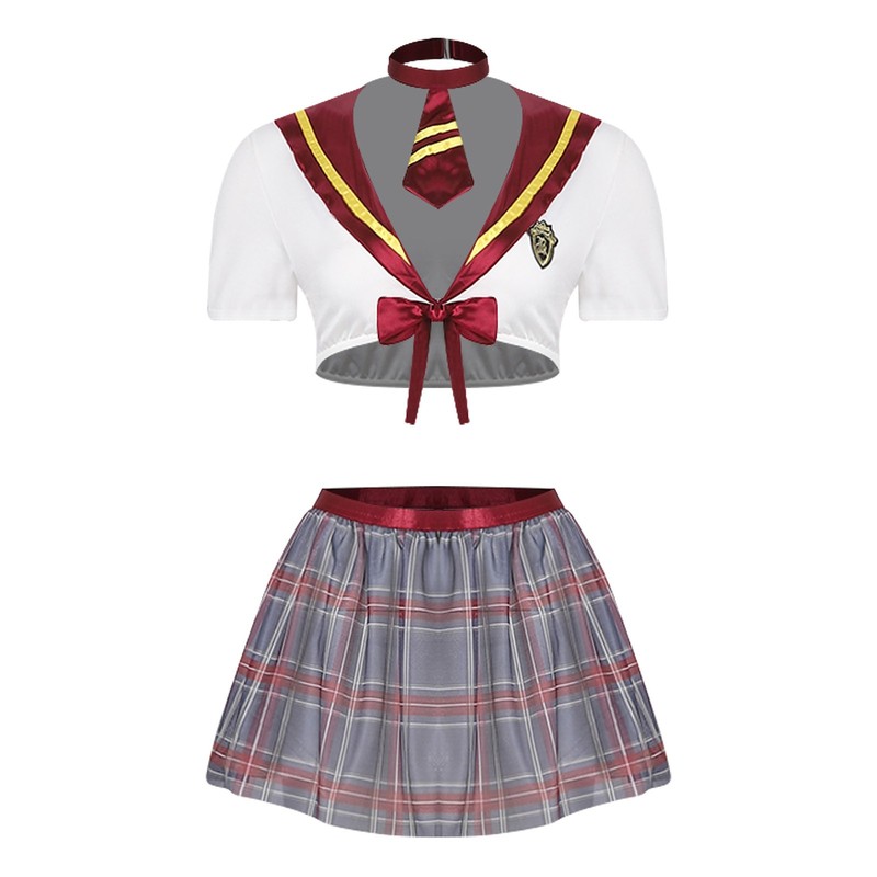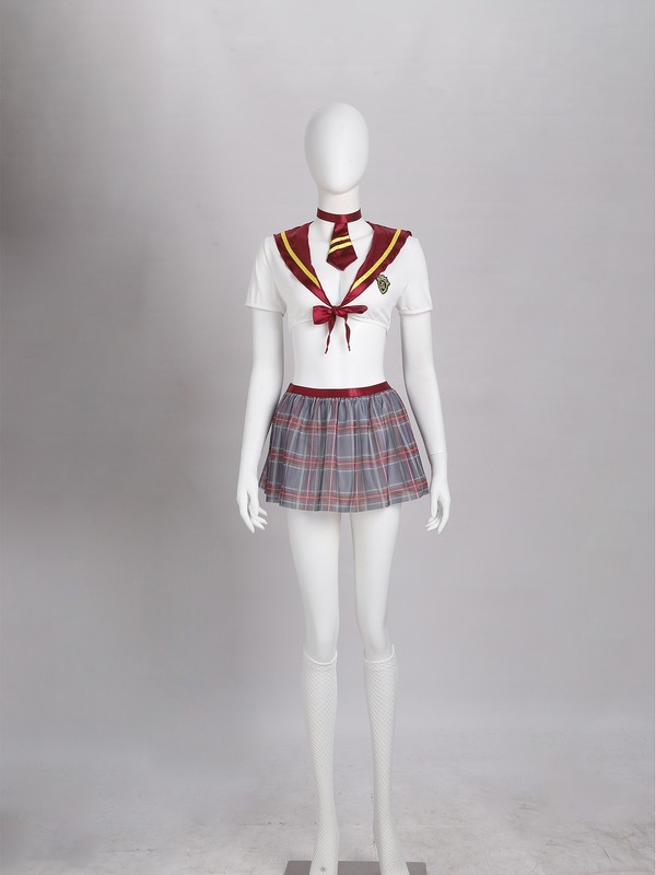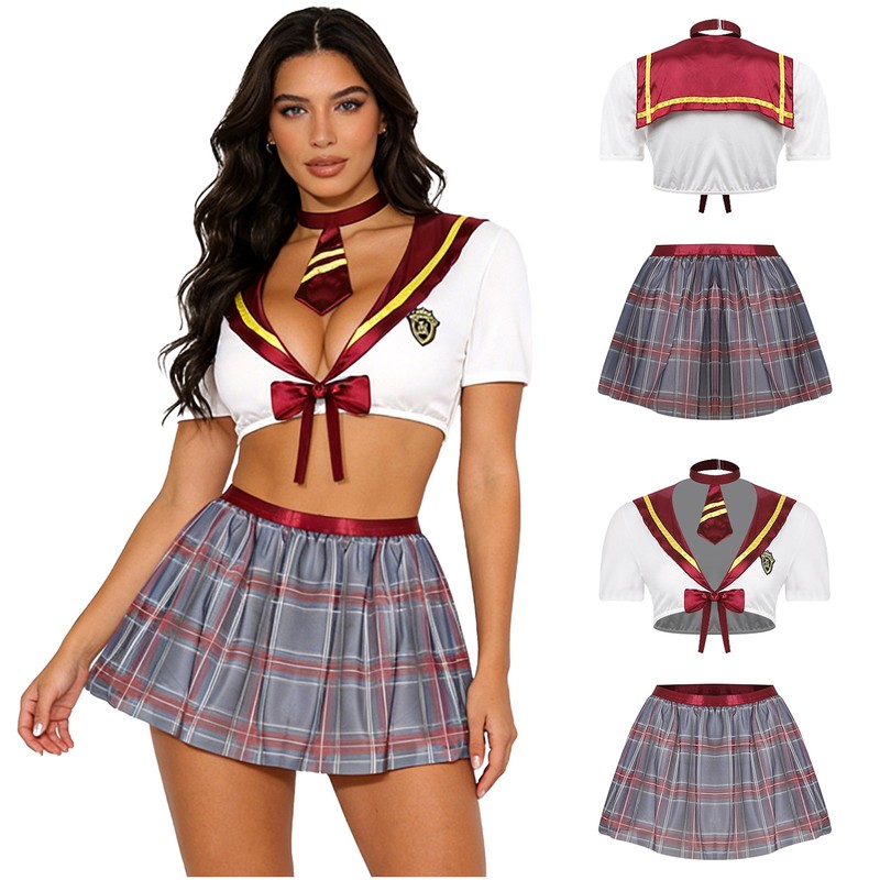 Set Include: 1Pc Crop Top, 1Pc Necktie, 1Pc Mini Skirt, 1Pc Thong, 1 Pair of Stockings
