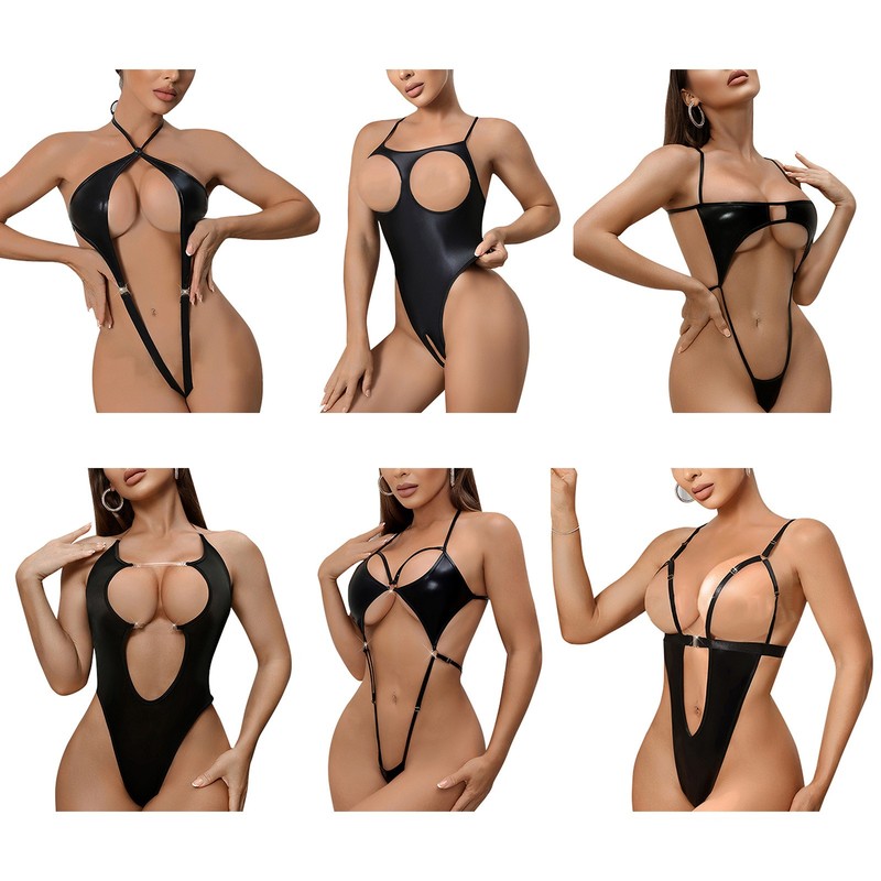 Front with see-through lace design, open butt and minimal coverage.