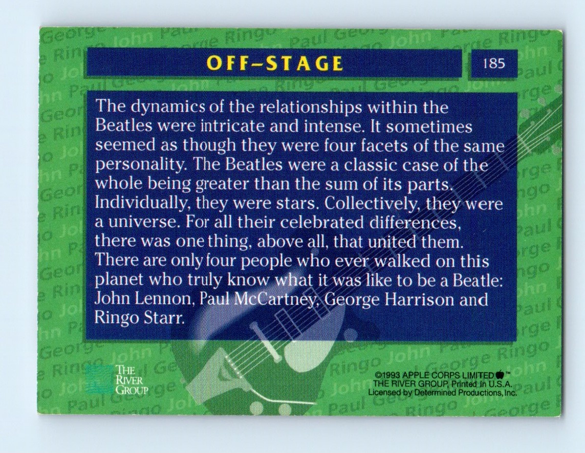 | Description: | The Beatles Collection | | Category: | Music | | Year: | 1993 | | Product: | The River Group | | Card Number: | 185 | | Dimensions: | 3½" x 2¾" | | SKU: | MU MU0001 R01 C (24) |