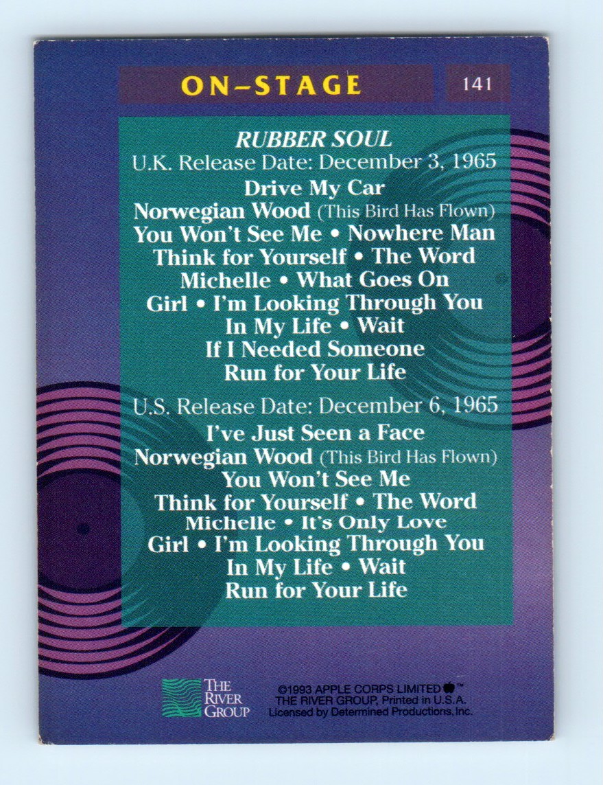 | Description: | The Beatles Collection | | Category: | Music | | Year: | 1993 | | Product: | The River Group | | Card Number: | 141 | | Dimensions: | 3½" x 2½" | | SKU: | MU MU0001 R02 E (29) |