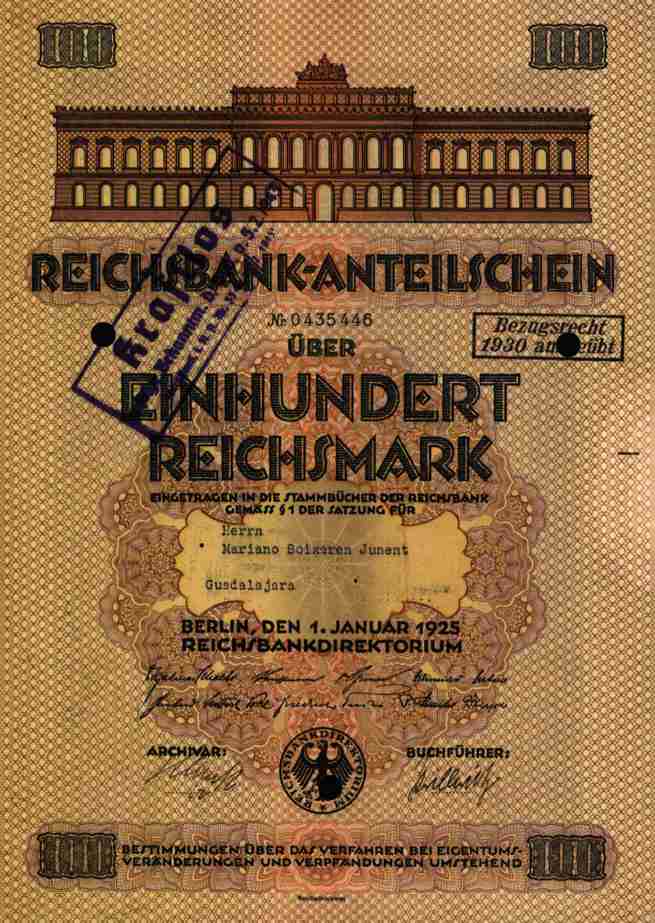 TOP Reichsbankpapier ### Kaum angeboten ## Orginalpapier -- siehe Archivbild -- der Reichsbank, Berlin. Namens - Anteilschein über 100 RM vom 1. Januar 1925. Ausgestellt auf Mariano B. Junent in Guadalajara. Die Deutsche Reichsbank war eine juristische Person des öffentlichen Rechts mit dem Sitz in Berlin. Sie durfte Zweiganstalten unterhalten. Die Aufgaben der Deutschen Reichsbank ergaben sich aus ihrer Stellung als Notenbank des Reiches. Sie hatte das ausschließliche Recht, Banknoten auszugeben. Sie hatte ferner den Geld- und Zahlungsverkehr im Inland und mit dem Ausland zu regeln sowie für die Nutzbarmachung der verfügbaren Geldmittel der deutschen Wirtschaft in gemeinnütziger und volkswirtschaftlich zweckmäßiger Weise zu sorgen. Gegründet durch das Bankgesetz vom 14.3.1875 mit Wirkung ab 1.1.1876 mit einem Grundkapital von M 120.000.000.-. Die Deutsche Reichsbank unterstand als deutsche Notenbank der uneingeschränkten Hoheit des Reiches. 1924 wurde die Reichsbank entsprechend dem Dawesplan eine von der Reichsregierung unabhängige Anstalt. Die Wahl des Reichsbankpräsidenten erfolgte durch den Generalrat, bestehend aus 14 Mitgliedern, davon sieben ausländische. Der Reichspräsident hatte lediglich Bestätigungsrechte. Nach der Machtübernahme durch die Nationalsozialisten 1933 wurde der Generalrat beseitigt, der Reichspräsident allein ernannte und entließ den Präsidenten sowie die Mitglieder des Direktoriums. Ab 1937 unterstand die Reichsbank wieder der Reichsregierung, ab 1939 direkt dem "Führer und Reichskanzler" Adolf Hitler, der damit selbst die Kredite an das Reich gewähren konnte. 1939 Umbenennung in Deutsche Reichsbank. Nach dem Zweiten Weltkrieg hörte die Deutsche Reichsbank auf zu existieren. Niederlassungen (1943): Neben der Reichshauptbank in Berlin bestanden im Reich 21 Reichsbankhauptstellen, 94 Reichsbankstellen, 402 Reichsbanknebenstellen. Dekorativer Druck der Reichsdruckerei mit dem Reichsbankgebäude oben. FS Unterschriften des Reichsbankdirektoriums - z.b. (erste Unterschrift) von Hjalmar Schacht (* 22. Januar 1877 in Tingleff, Nordschleswig; † 3. Juni 1970 in München) von 1923 bis 1930 und von März 1933 bis Januar 1939 Reichsbankpräsident sowie von 1934 bis 1937 Reichswirtschaftsminister. Papier mit der üblichen Lochentwertung, Papier in guter Erhaltung : EF. ### Aktie im A 4 Hochformat -- bestens geeignet für jeden Bilderrahmen !!!