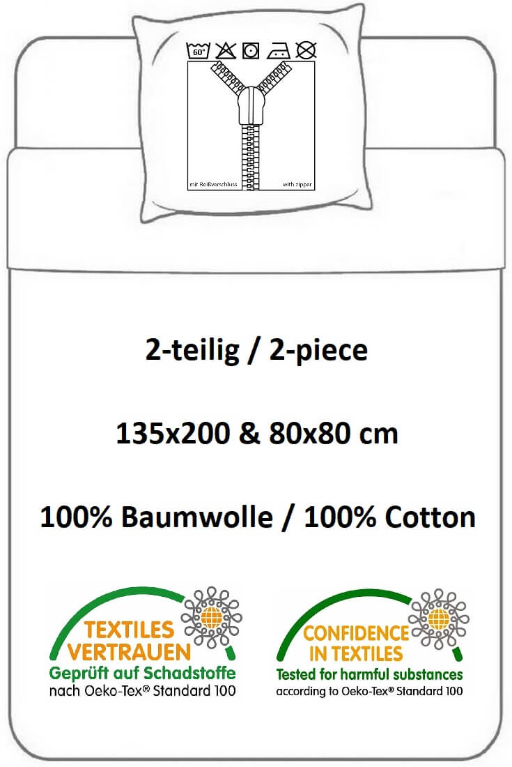 Die Bezüge in der Größe 135x200 cm - Bettbezug und 80x80 cm - Kissenbezug eignen sich für Einzelbetten von Kindern, Jugendlichen und Erwachsenen und sind für einen erholsamen und idealen Schlaf schadstoffgeprüft.