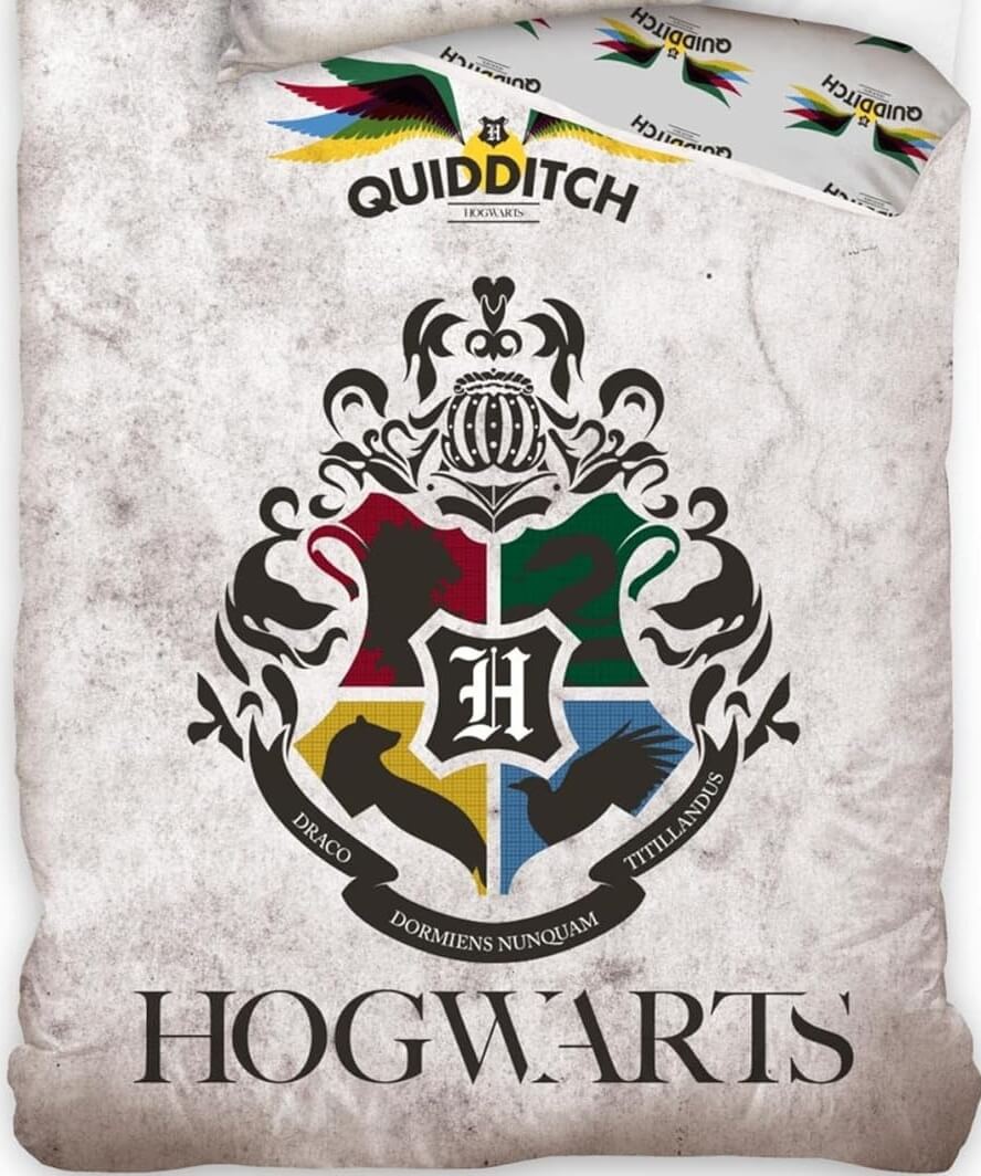 Der Bettbezug besteht aus einer hellgrau marmorierten Vorderseite mit dem Hogwarts-Schulwappen sowie aus einer hellgrauen Rückseite mit einem Allover-Druck des beliebten Spiels "Quidditch". Das Schulwappen repräsentiert die Symboltiere der Häuser Gryffindor - Löwe, Slytherin - Schlange, Ravenclaw - Adler und Hufflepuff - Dachs, die den großgeschriebenen Buchstaben "H" umgeben. Darunter zeigt eine Pergamentrolle das Schulmotto: "Draco dormiens nunquam titillandus" - "Kitzle nie einen schlafenden Drachen".