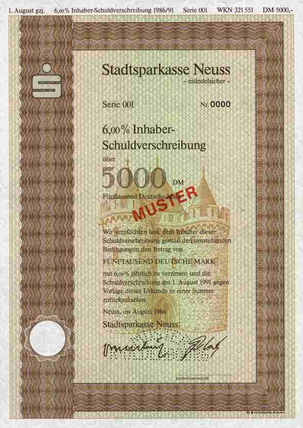 TOP regionaler Bankwert !!! Inhaber - Schuldverschreibung (Blanketten - Muster - nullgeziffert) zu 6,0 % Serie 001 über 5.000 DM der Sparkasse Neuss im August 1986. Hauptstellen u.a. in Dormagen, Grevenbroich, Jüchen, Korschenbroich, Kaarst und Meerbusch (alle Rhein-Kreis Neuss). Interessantes Dokument kommunaler Kreditwirtschaft !! ! Zum 1.3. 1994 wurde die SV zurück bezahlt und alle Papiere dann vernichtet. Dekorativer Druck mit dem Neusser Tor. Großes Sparkassenwappen oben links und geprägt im Trockensiegel !! Sammlerfreundlicher Sonderpreis !