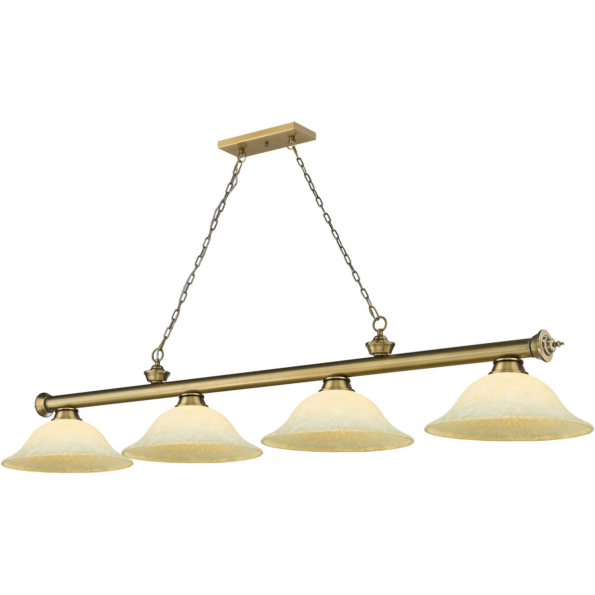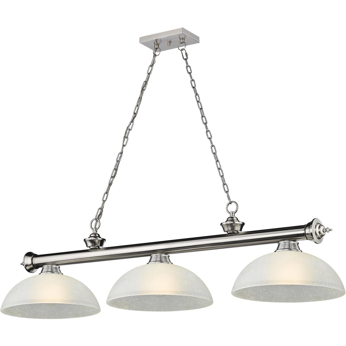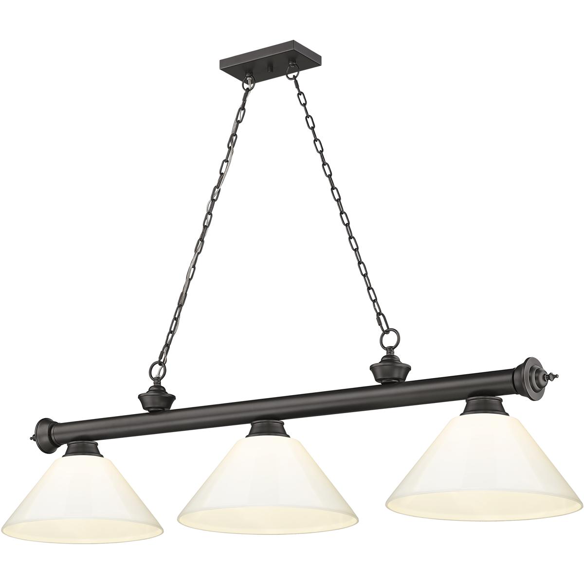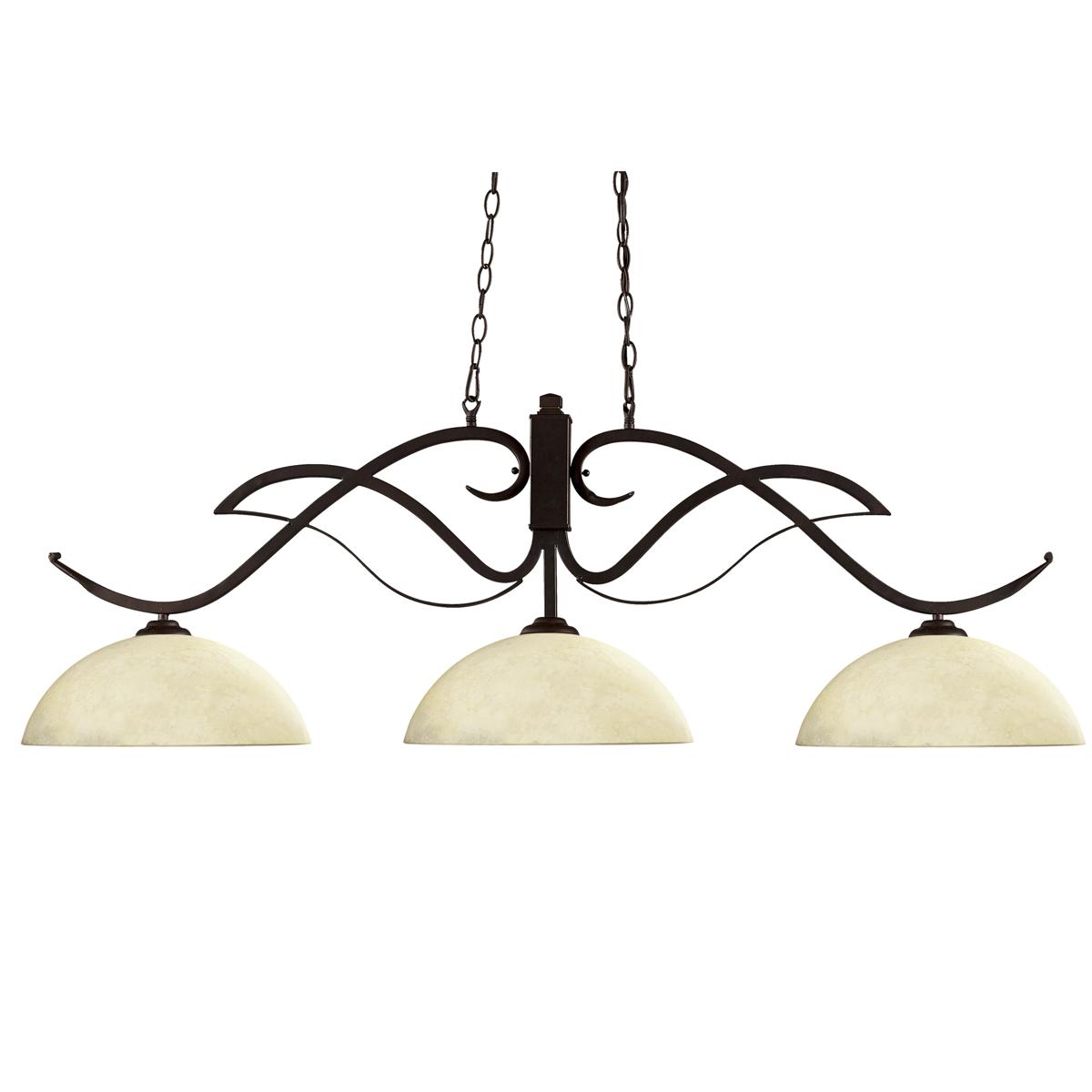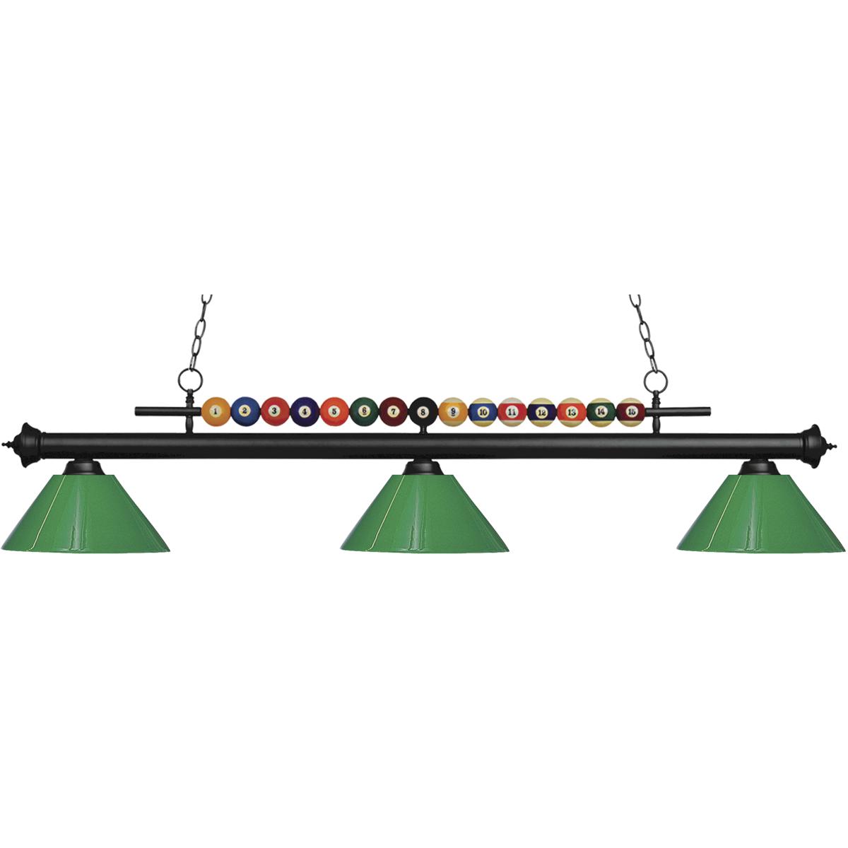 Playful pool ball motifs best describe this beautiful three light fixture. Finished in Matte Black and paired with Green plastic shades, this three light fixture would be at home in the game room. 72 inches of chain per side is included to ensure the perfect hanging height.