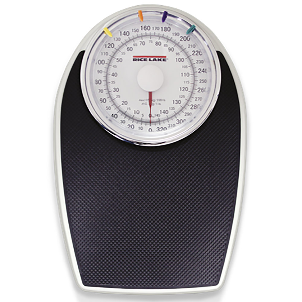 The RL-330 HHD that displays weight in pounds and kilograms. It's steel base features a large non-slip platform and a nearly 8-inch diameter dial. The rounded form can be positioned in a corner providing easy access. Bright markers can be used for record and goal keeping. value on the display, even after stepping off of the scale. Tap to turn on; it automatically switches off. Lithium battery is included.