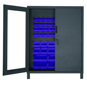 Bin Dimensions: (36) 6"x11"x5", (12) 8"x15"x5", (6) 16"x15"x7" Doors: 1 clear, 1 solid flush style, full height 7 gauge leaf hinge to prevent sagging, pen at 180 degrees for full access to product Legs: 6"H base/legs which provide access for forklifts: pre-punched holes for lagging to the floor Ships: Fully Assembled - No tools required for installation Finish: Durable gray powder coat| Brand | Durham |