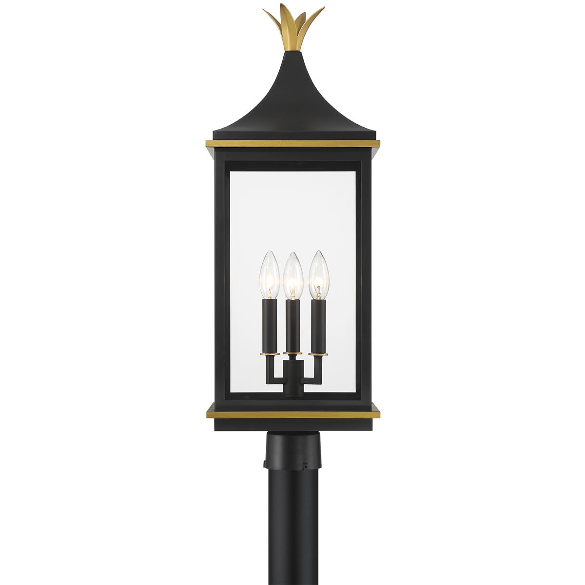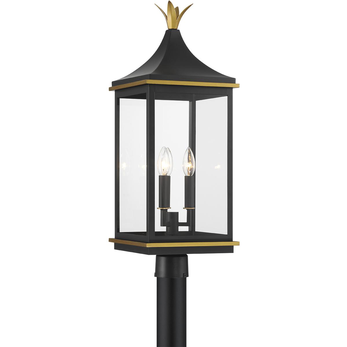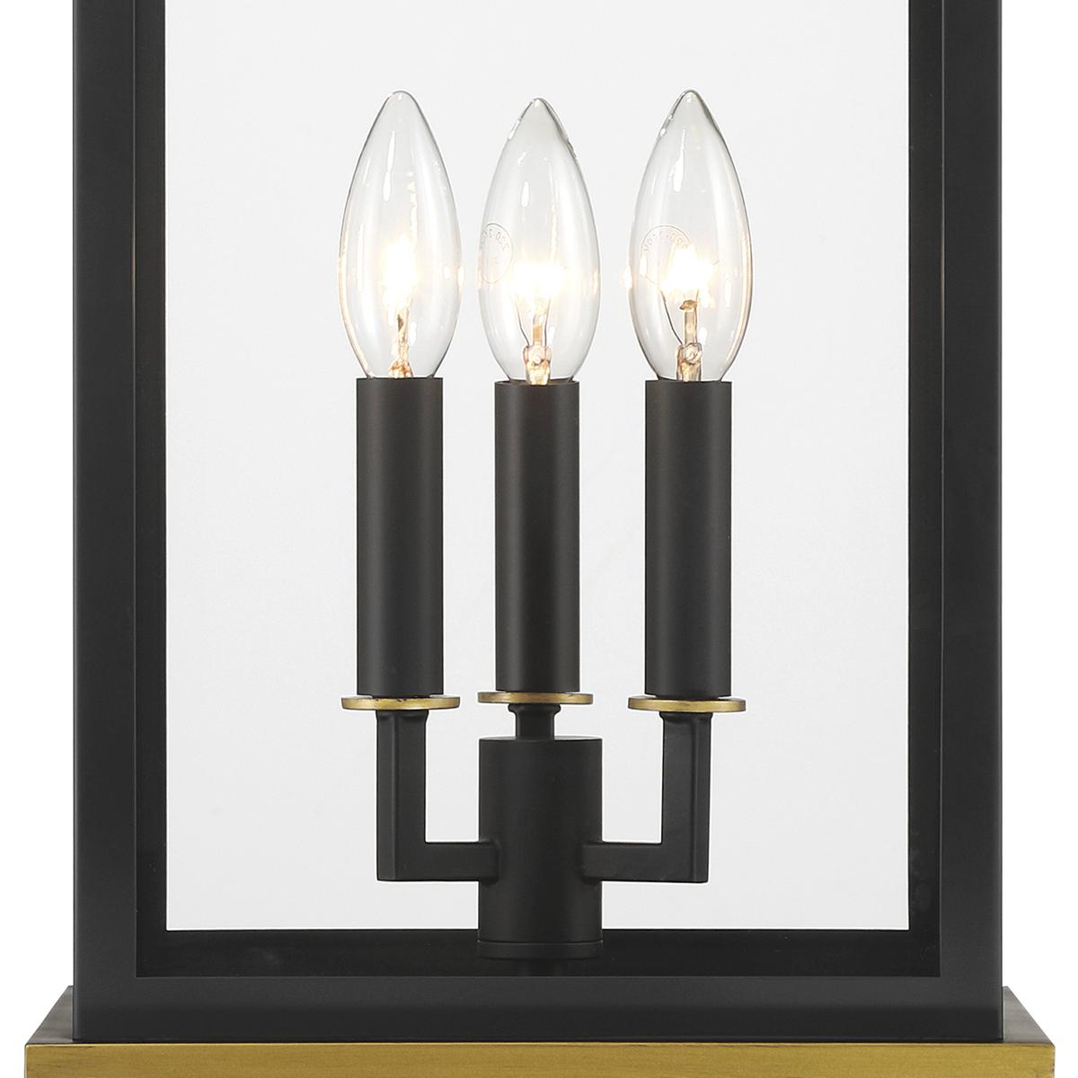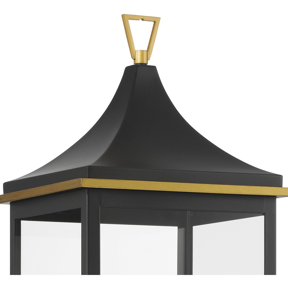 The Simpson Outdoor Collection features a lantern-style design with a two-tone finish. Its elongated rectangular frame, elegant glass panels, and candelabra bulbs create a classic look with a contemporary edge. The collection includes two options for customizing the top: a gold crown cap for a traditional flair or a sleek angled loop for a more contemporary appearance. This versatile design adds a stylish touch to any outdoor setting.