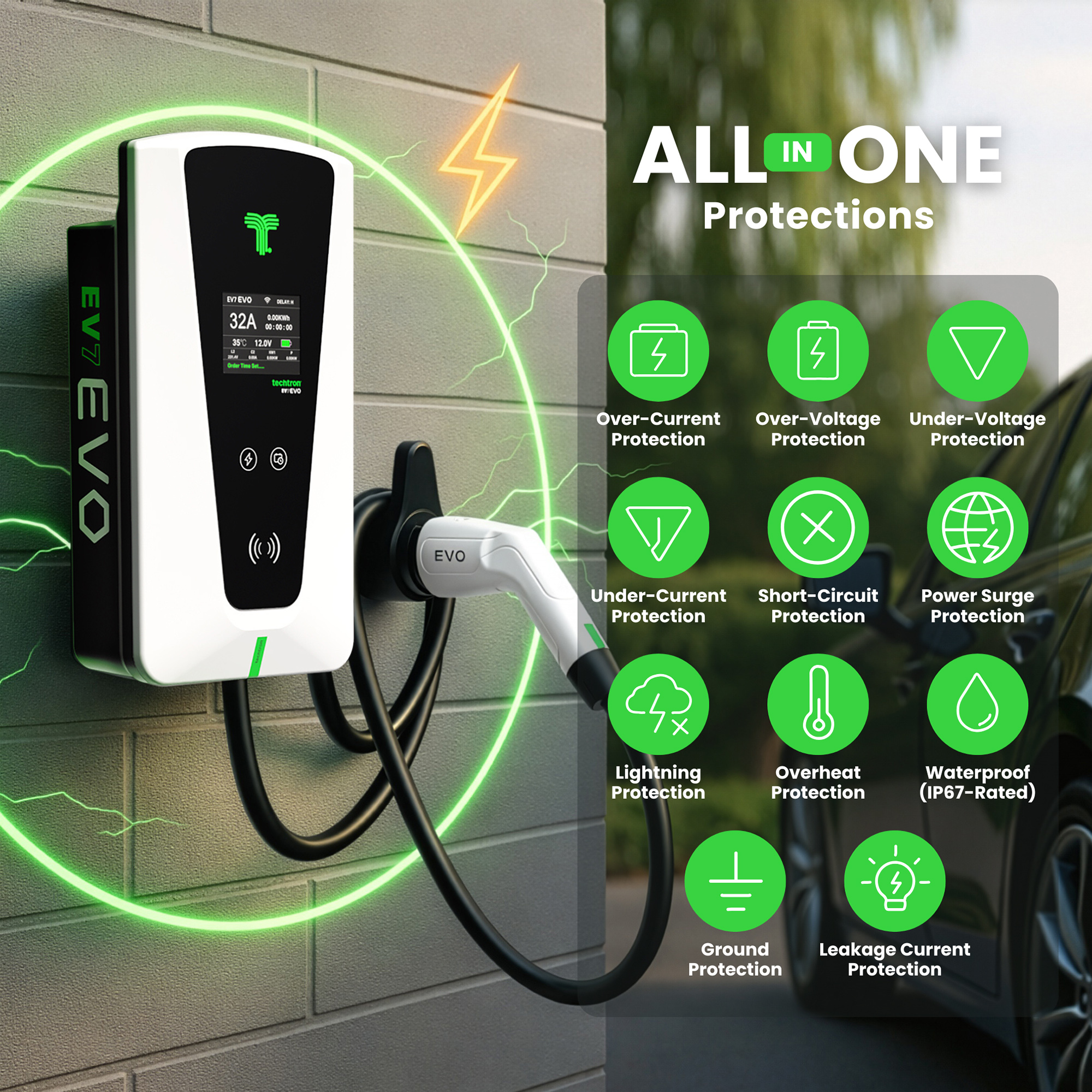 Engineered with comprehensive all-in-one safety protections — including over-current, surge, lightning, leakage, and IP67 waterproof protection — ensuring reliable, secure, and worry-free EV charging every time. ⚡🔒