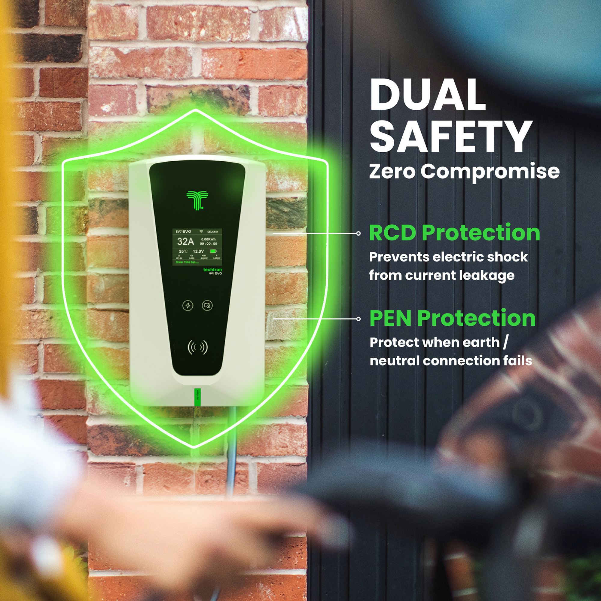 The techtron® EV Charger features dual safety systems with integrated RCD and PEN protection, safeguarding against current leakage and earth-neutral faults — delivering secure, reliable EV charging with zero compromise. ⚡🛡️