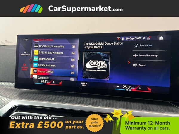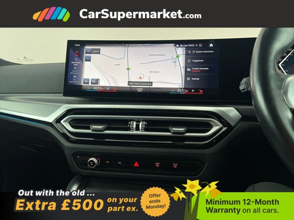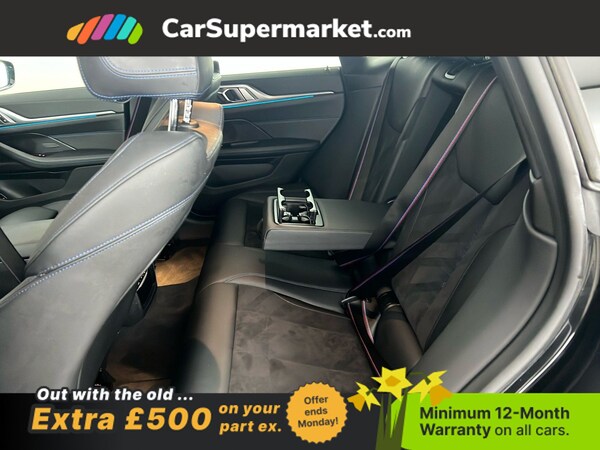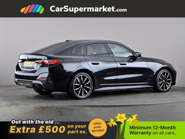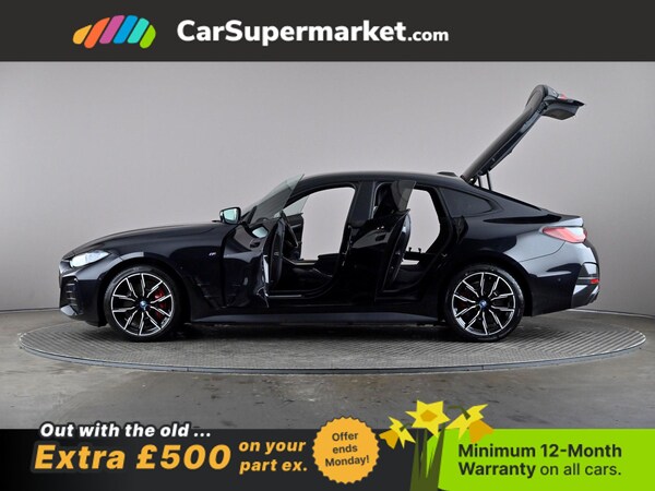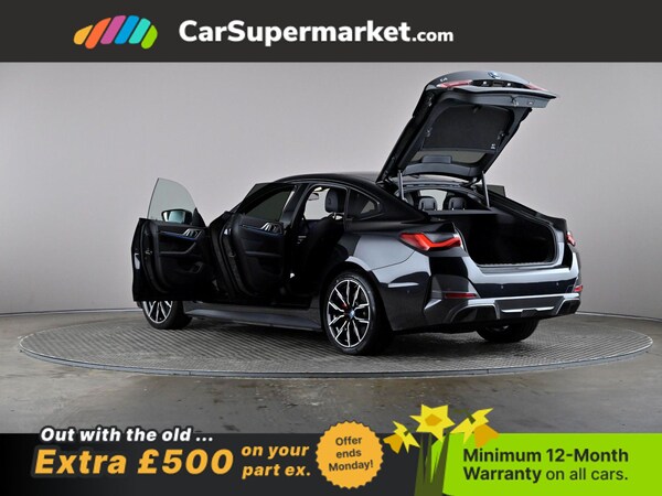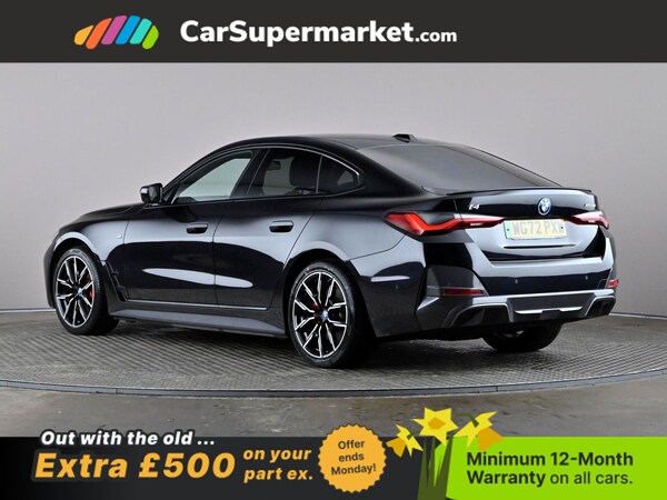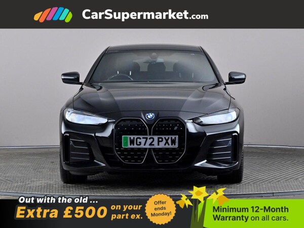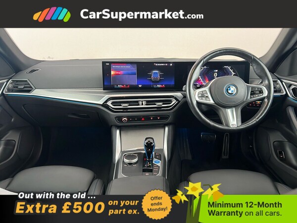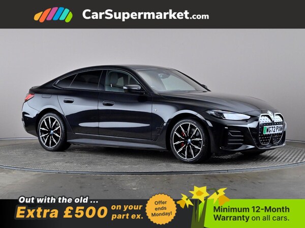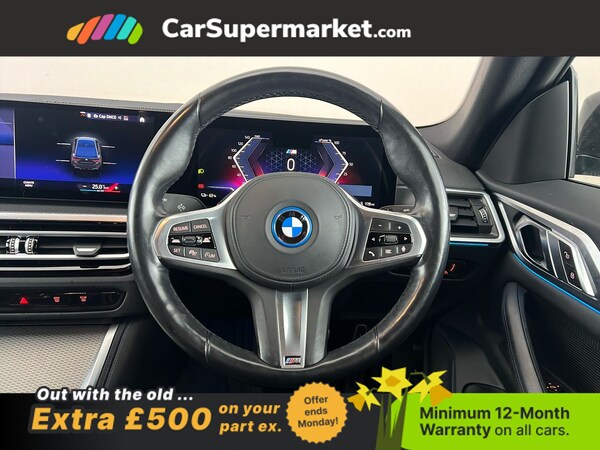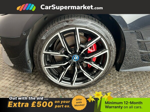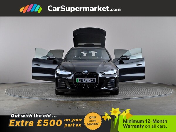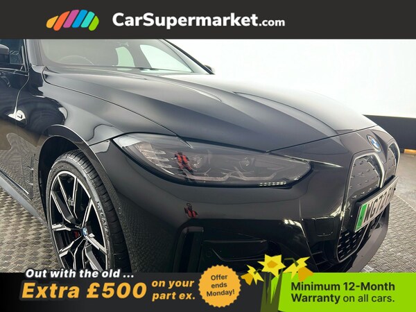 BMW i4 eDrive40 M Sport (Black) A fully electric performance saloon combining strong acceleration with premium comfort. Includes cruise control, sat nav, and heated front seats. Optional extras include Black Sapphire paint, M Sport Pro Package, model-specific design elements, sun protection glass, 19in alloy wheels, and Alcantara-Sensatec interior with blue stitching. Minimum 12-month warranty. MOT due 04/01/2027.