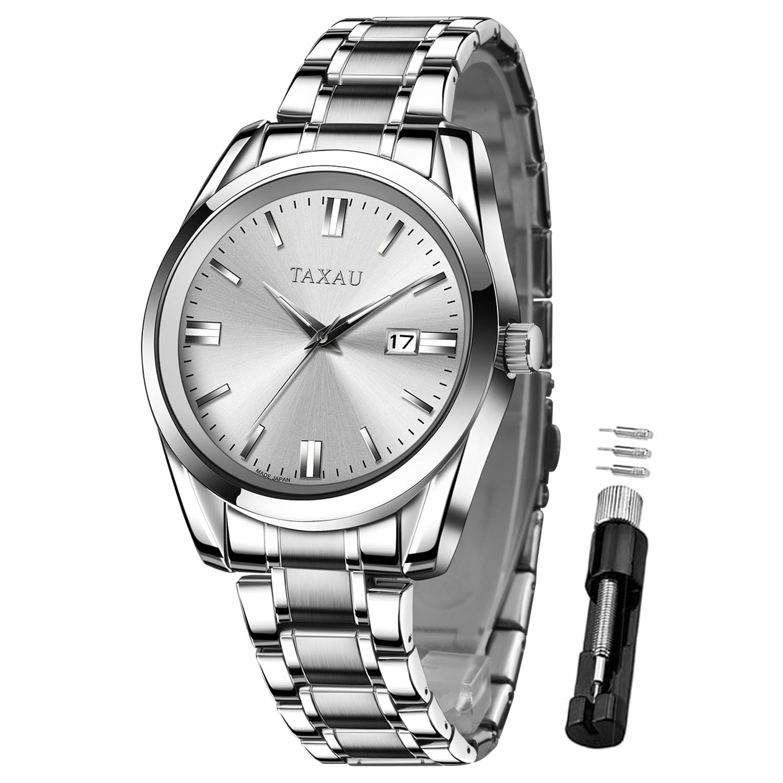 Taxau Watches for Men Waterproof Mens Silver Watch Dress Analog Stainless Steel Watches Luxury Mens Watch with Date for Minimalist Large Wrist Big Face Relojes para Hombres